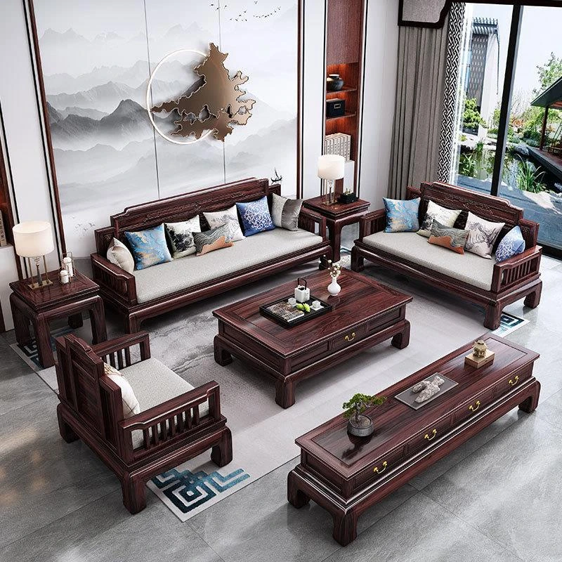 紫金檀の無垢材を使用した新中式モダンソファセット|シンプルでスタイリッシュ、大小さまざまな部屋にぴったり|冬も夏も快適に使える収納付きソファで、生活を豊かに!