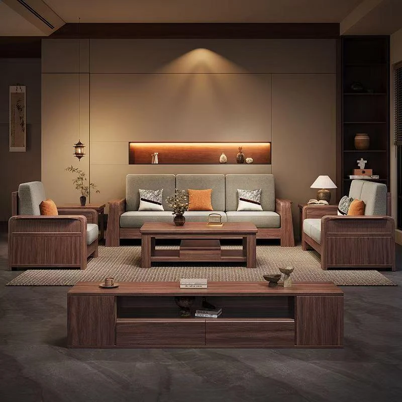 新中式スタイルの無垢材ソファセット - モダンでシンプル、豪華なヴィラ向けの大空間にぴったり!榫卯構造と布製のデザインが魅力的なラグジュアリー家具で、あなたのリビングを特別な空間に変えます。