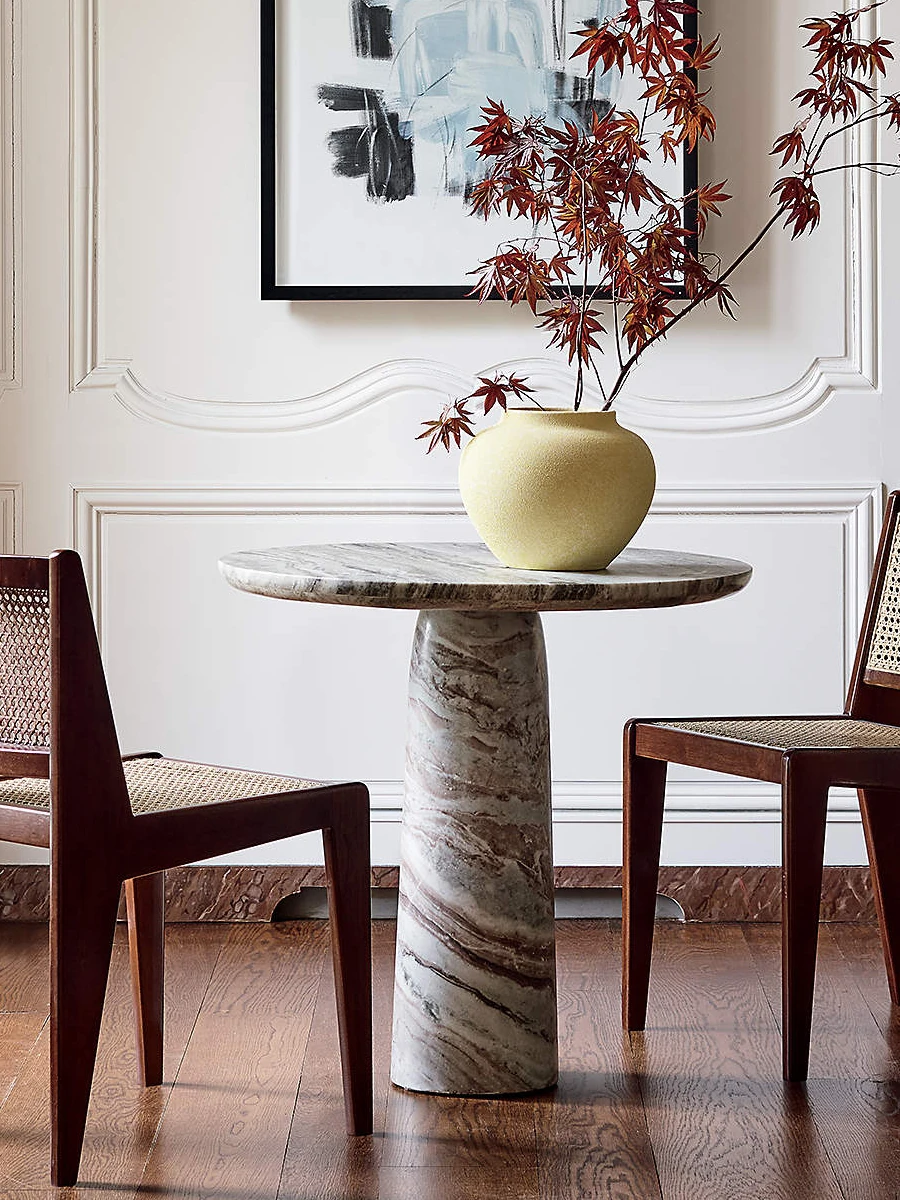 侘寂スタイルの高級感漂う天然大理石ダイニングテーブル - 小型住宅やヴィラに最適な洗練されたデザイン、リビングルームにぴったりの食卓で、心地よいひとときを演出します。