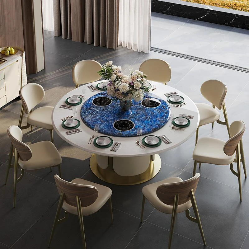 電動ダイニングテーブル - 磁気炉付き、カリビアンクリスタルブルー&翡翠の贅沢な石材天板、ラグジュアリー感漂う円形デザインで、食事の時間を特別に演出します。