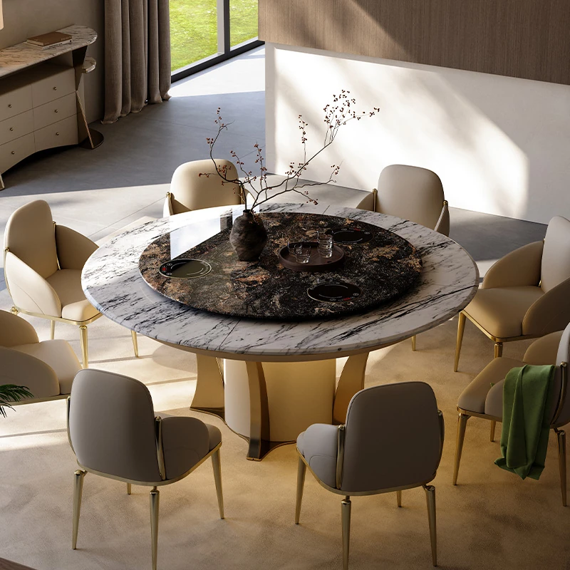 輸入された大理石のダイニングテーブル、モダンでシンプルなデザイン、天然素材の贅沢感を楽しめます。全室にマッチするスタイルで、内蔵回転盤付きの無垢材のラウンドテーブルで、毎日の食卓を特別な空間に演出します。