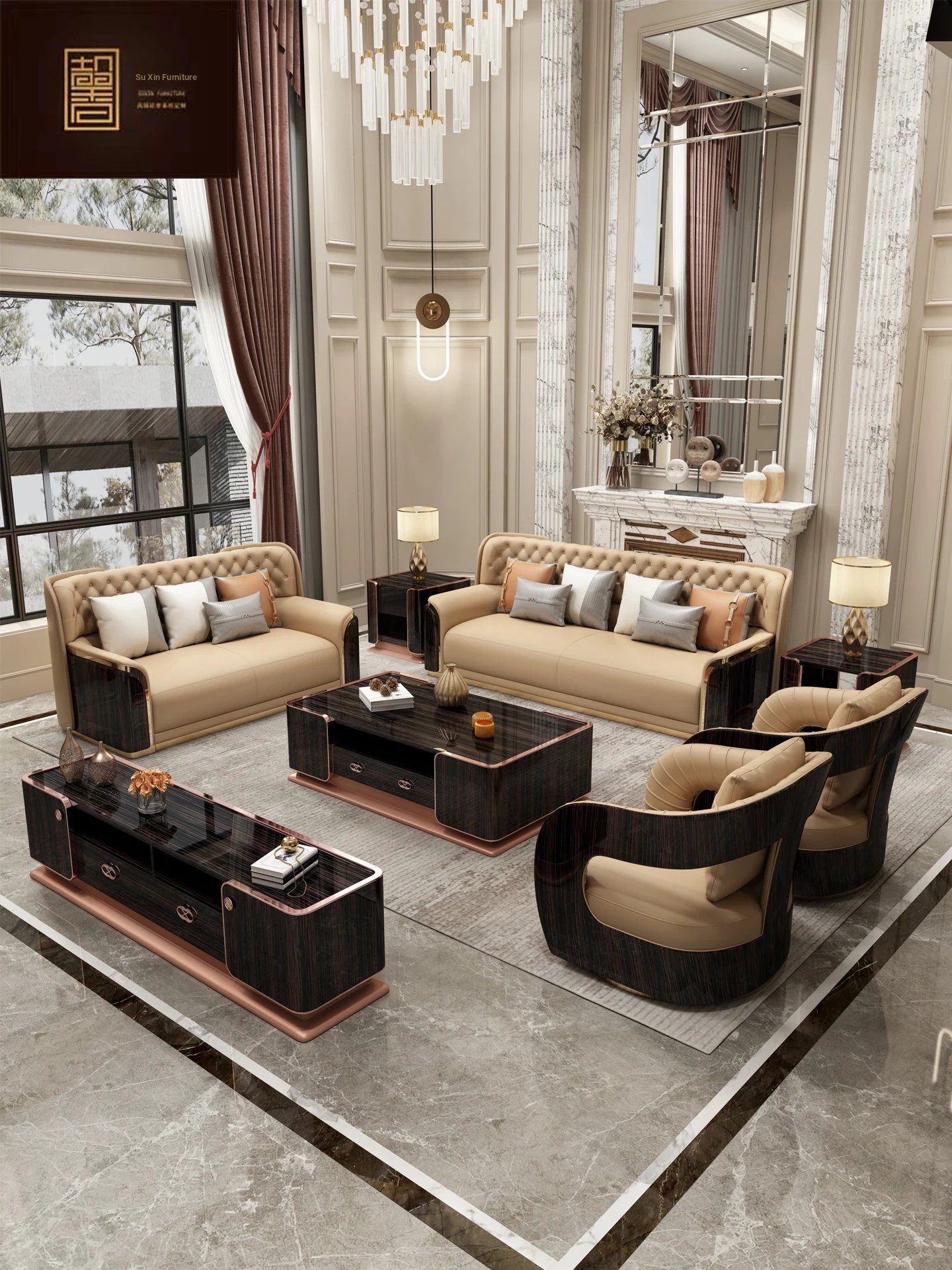 Luxurious European-style Genuine Leather Sofa Set - High-Quality Top Grain Leather with Exquisite Solid Wood Carvings for Spacious Villas and Large Living Rooms - 124 Combination