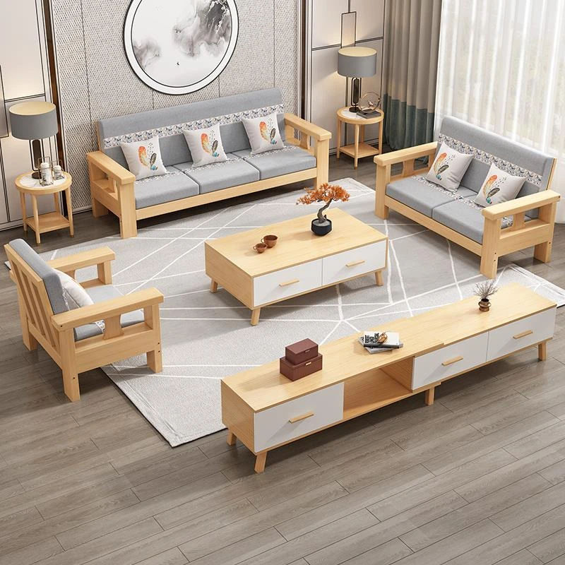 Modern Minimalist Solid Wood Sofa, Coffee Table, and TV Cabinet Set for Small Spaces - Perfect for Stylish Home Living