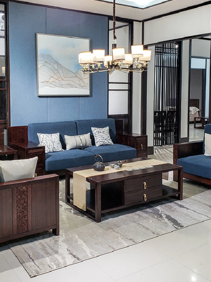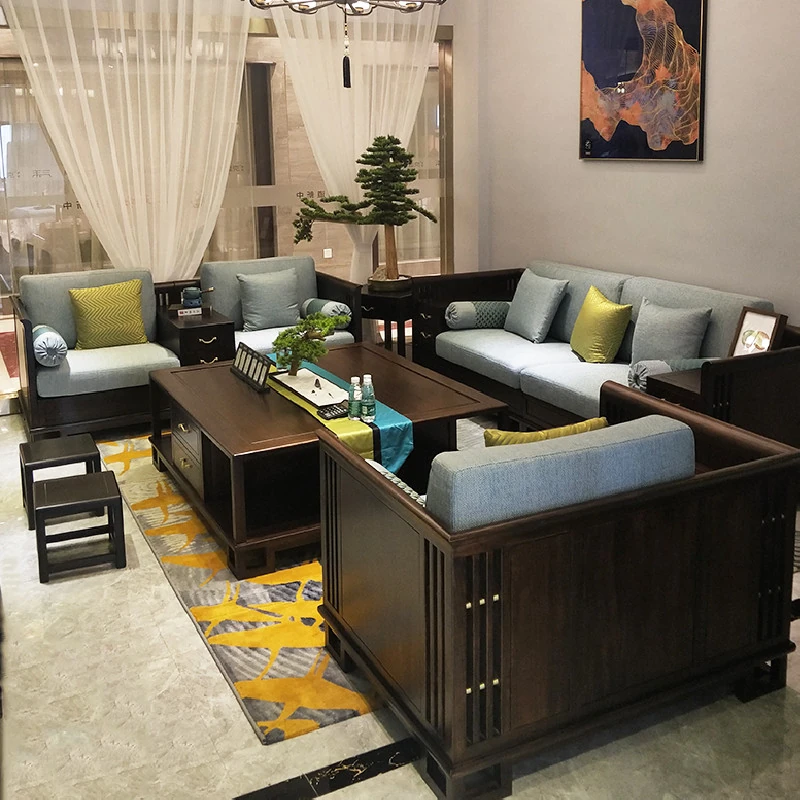 Elegant New Chinese Style Ebony Wood Sofa - Luxurious Zen-Inspired Living Room Set with Fabric and Solid Wood Leather Combination for Villas