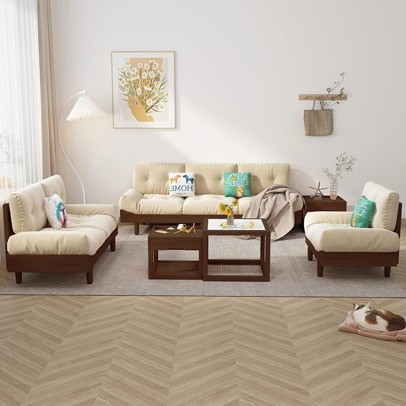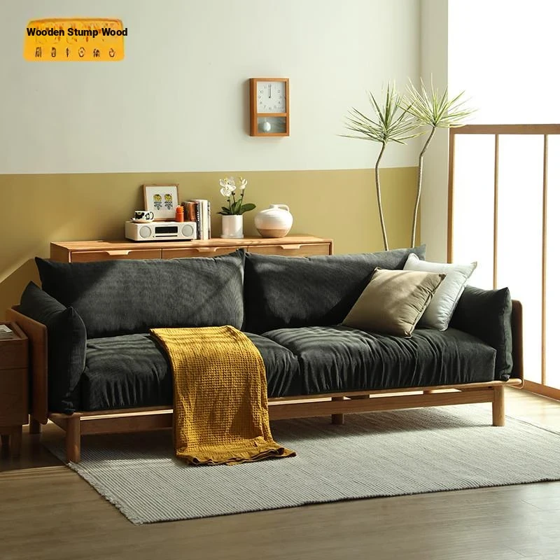 Nordic Solid Wood Sofa Set - Modern Minimalist Cherry Wood Double Three-Person Fabric Sofa for Small Spaces, Perfect for Your Living Room