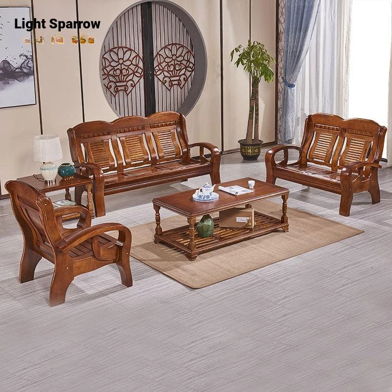 Modern Minimalist Solid Wood Sofa Set for Small Spaces - 1+2+3 Traditional Chinese Style Living Room Furniture, Perfect for Cozy Homes