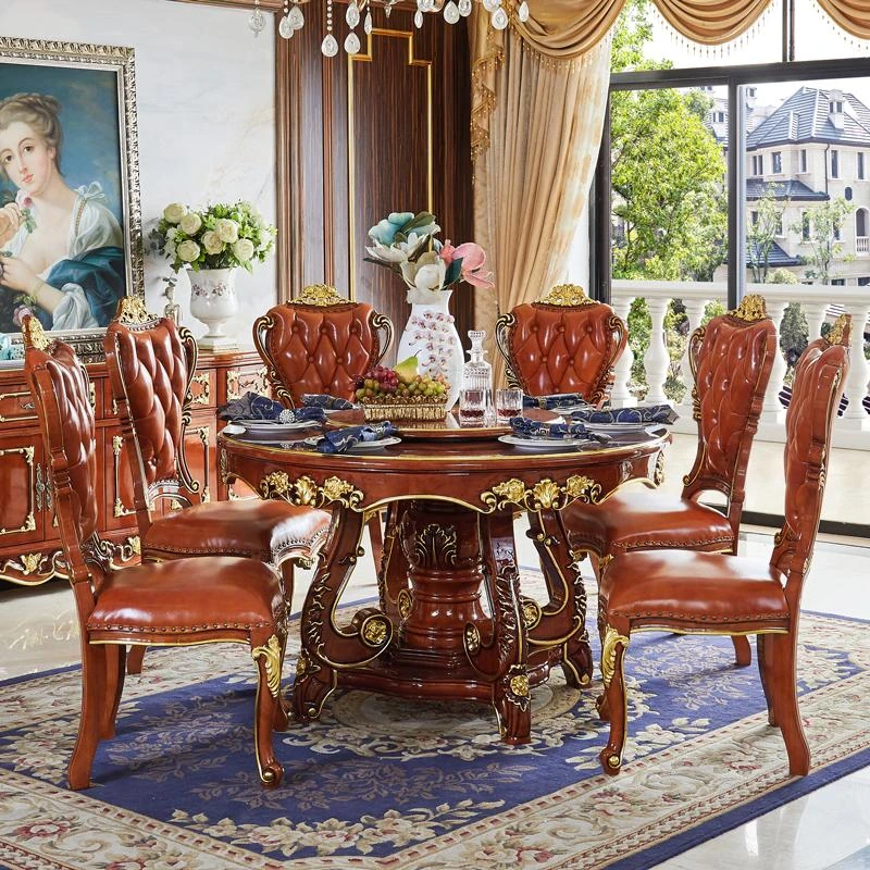 Elegant European Style Solid Wood Round Dining Table with Marble Top - American Round Table Set with Chairs, Perfect for Home Use, Includes Lazy Susan and Hot Pot Feature