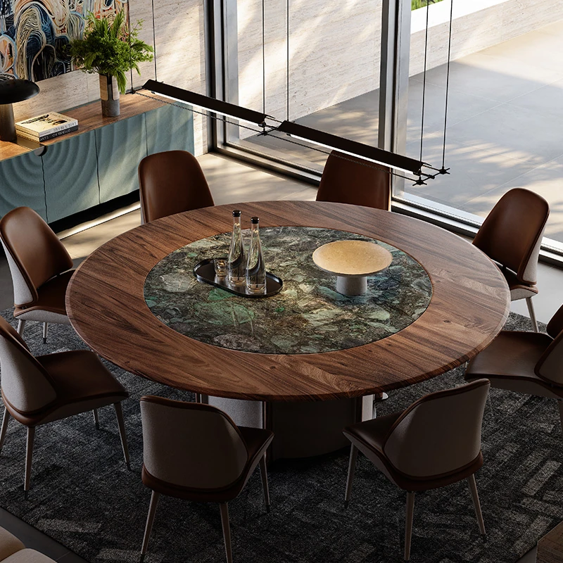 Italian Minimalist Luxury Solid Wood Round Dining Table and Chair Set with Artistic Design and Marble Lazy Susan for Contemporary Dining Rooms