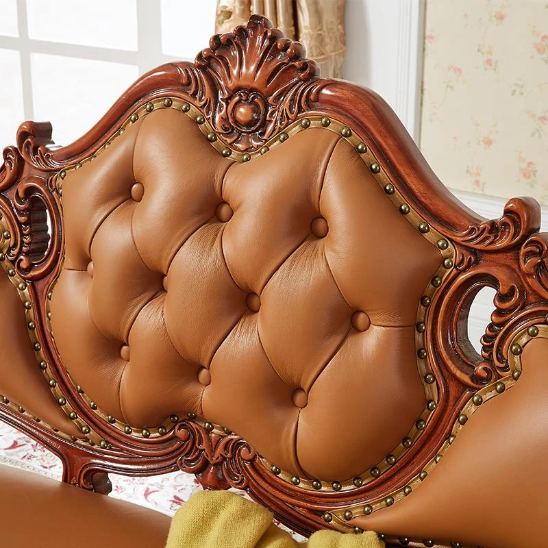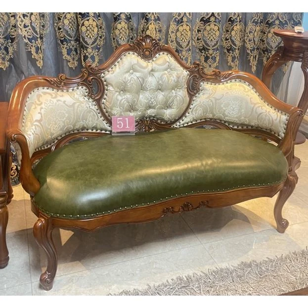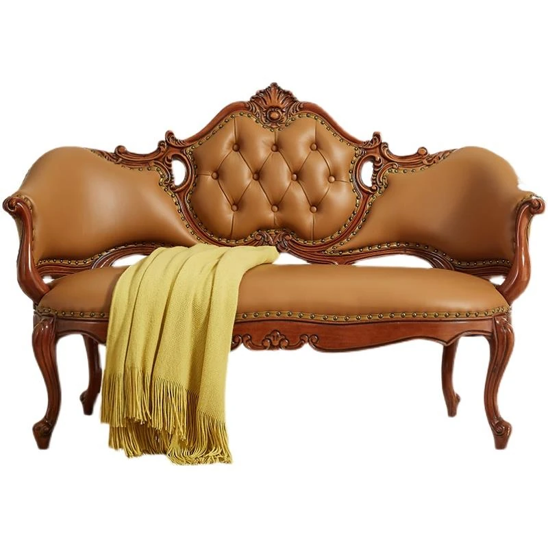 American Solid Wood Chaise Lounge Chair with Genuine Leather - Elegant Carved Sofa Chair for Living Room, Perfect for Conversations and Relaxation, European Style Recliner and Bed End Bench