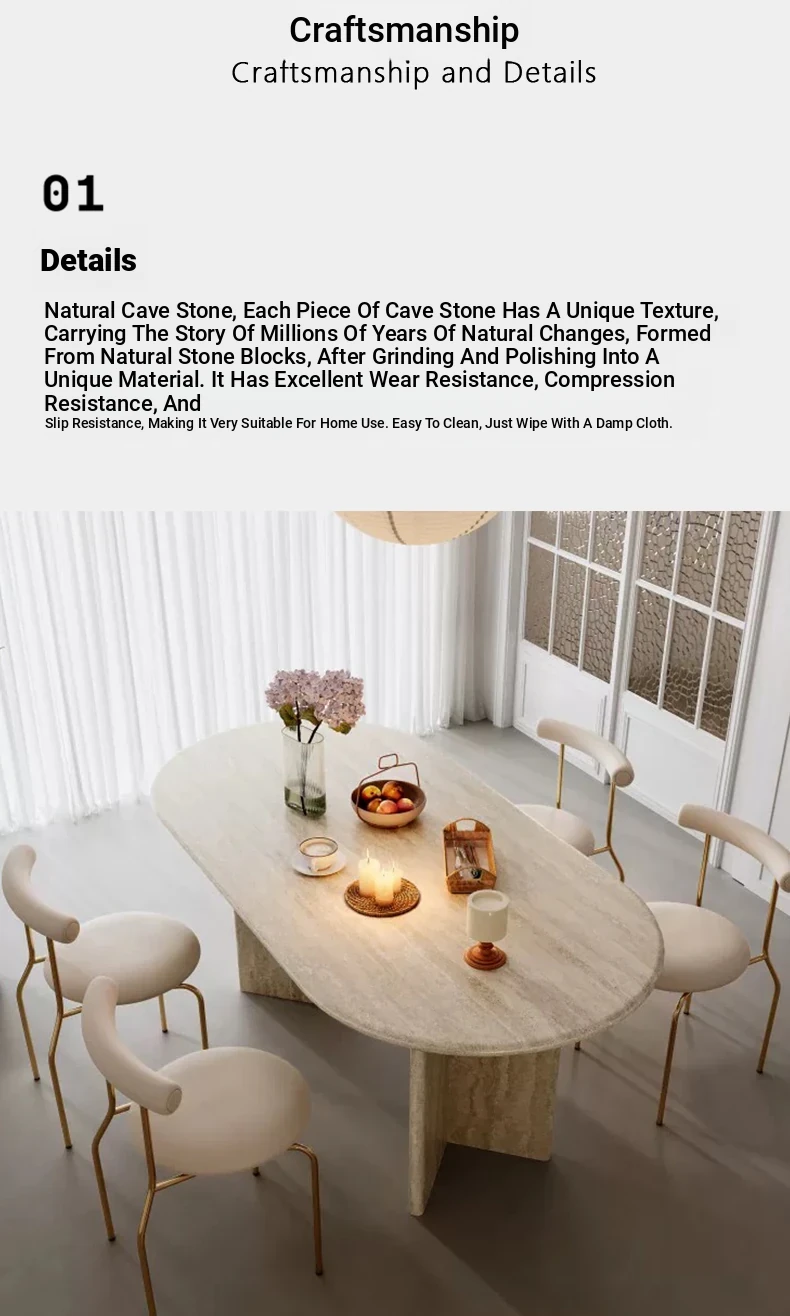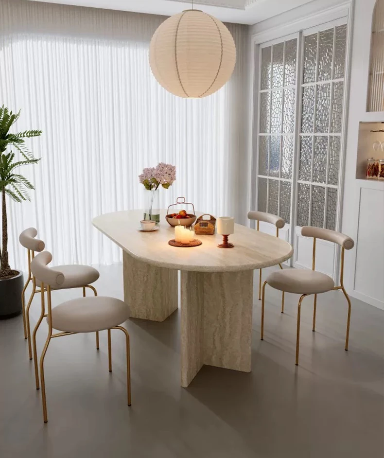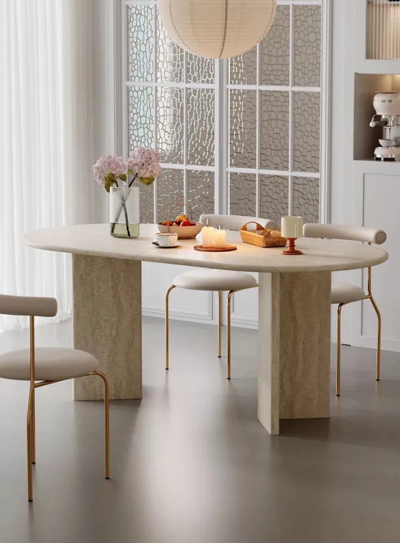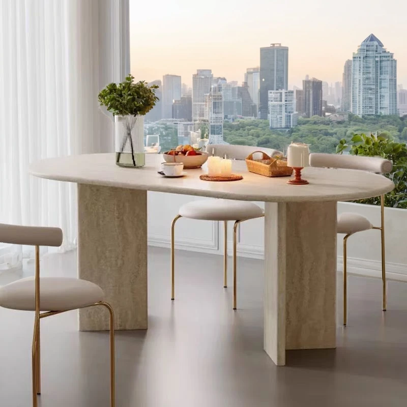 Elegant Modern Minimalist Natural Marble Dining Table - Long Oval Design for Home Use, Perfect for a Wabi-Sabi Aesthetic in Your Dining Room.