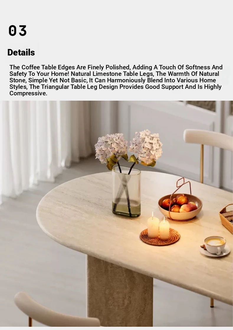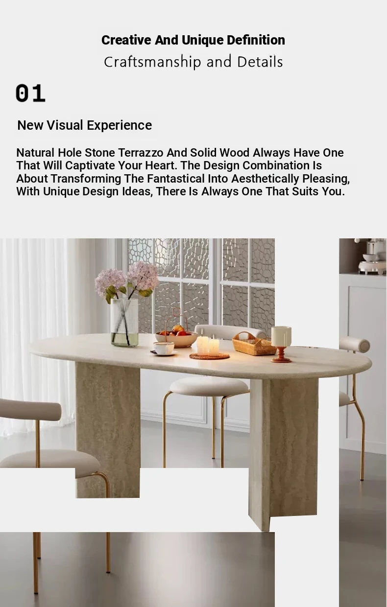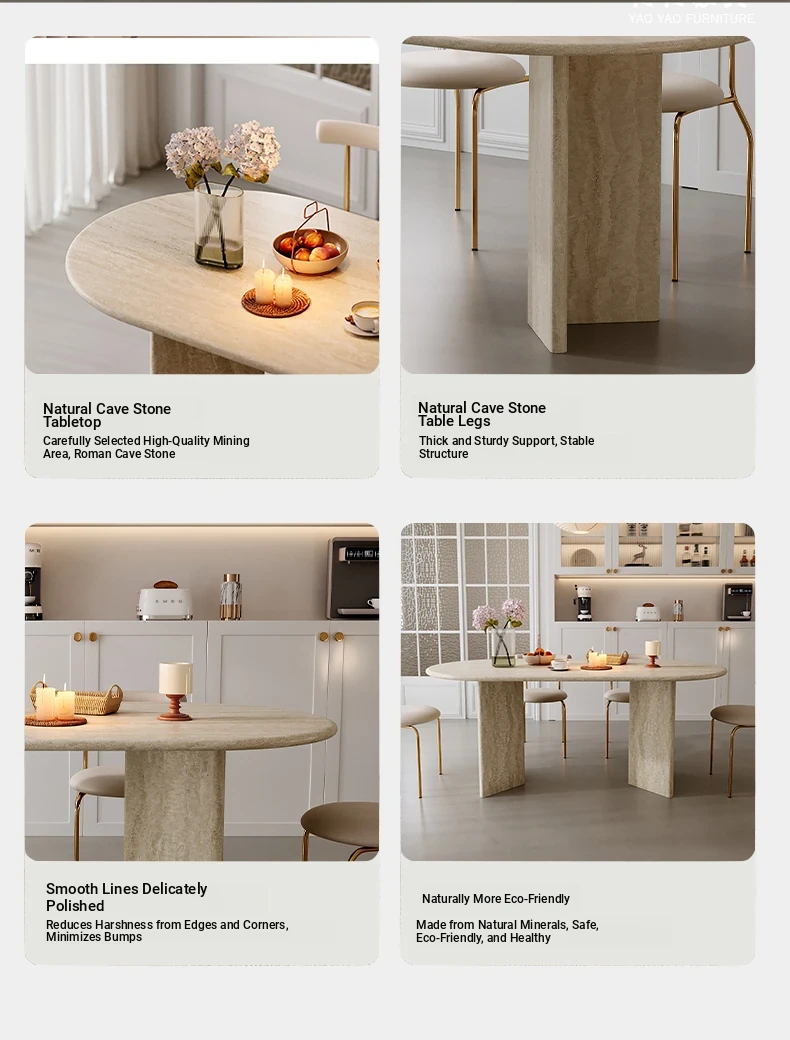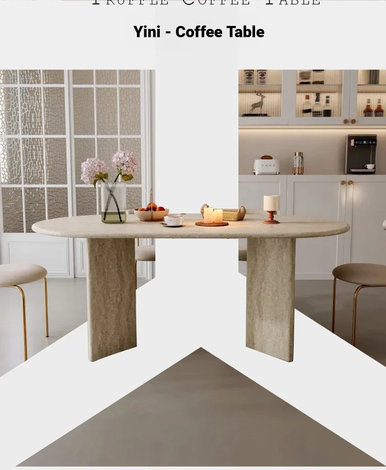 Elegant Modern Minimalist Natural Marble Dining Table - Long Oval Design for Home Use, Perfect for a Wabi-Sabi Aesthetic in Your Dining Room.