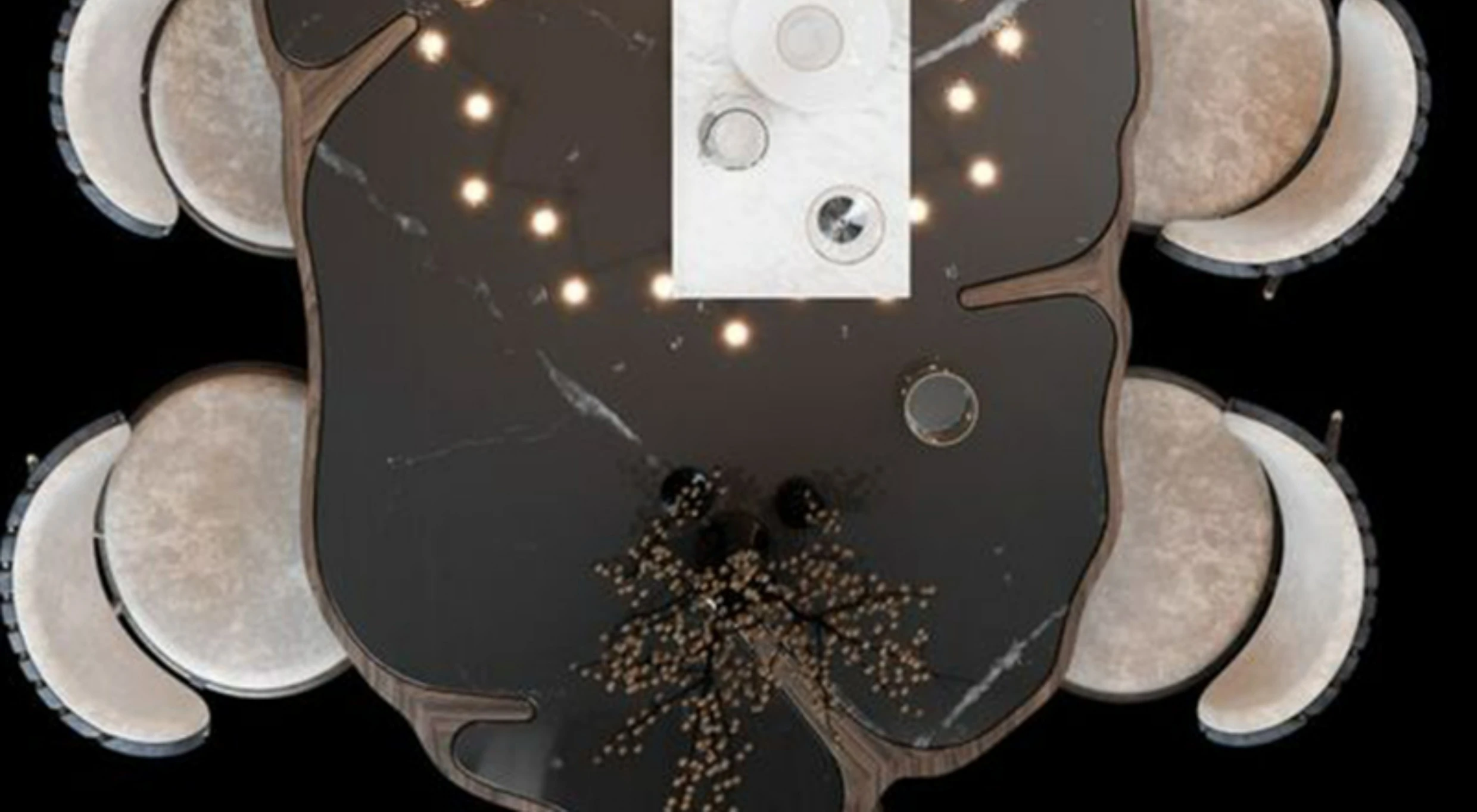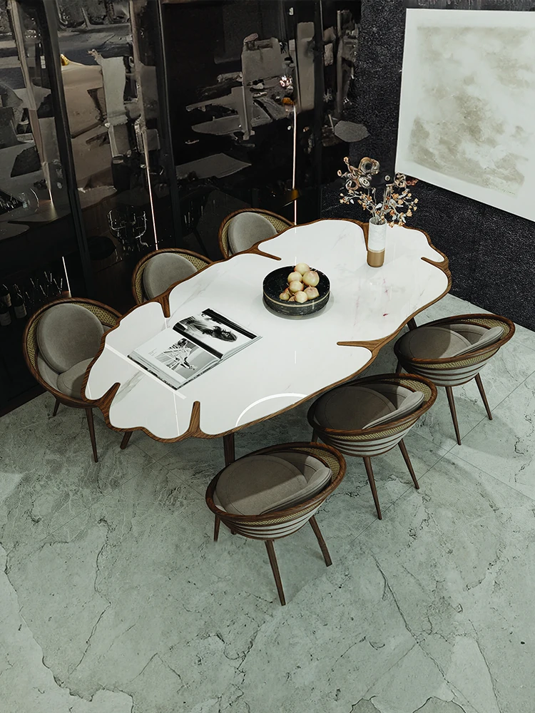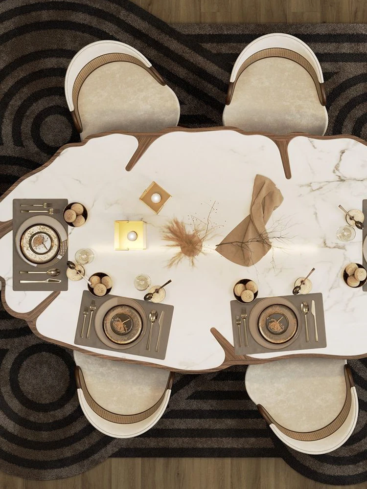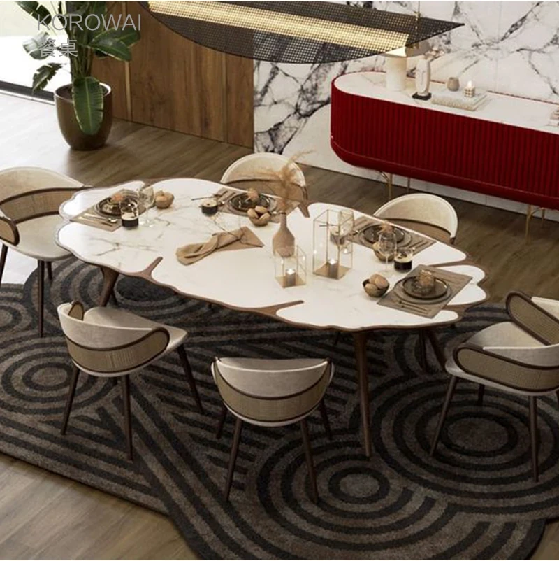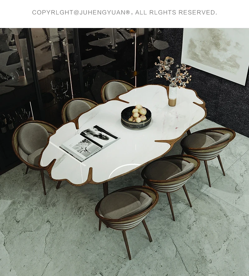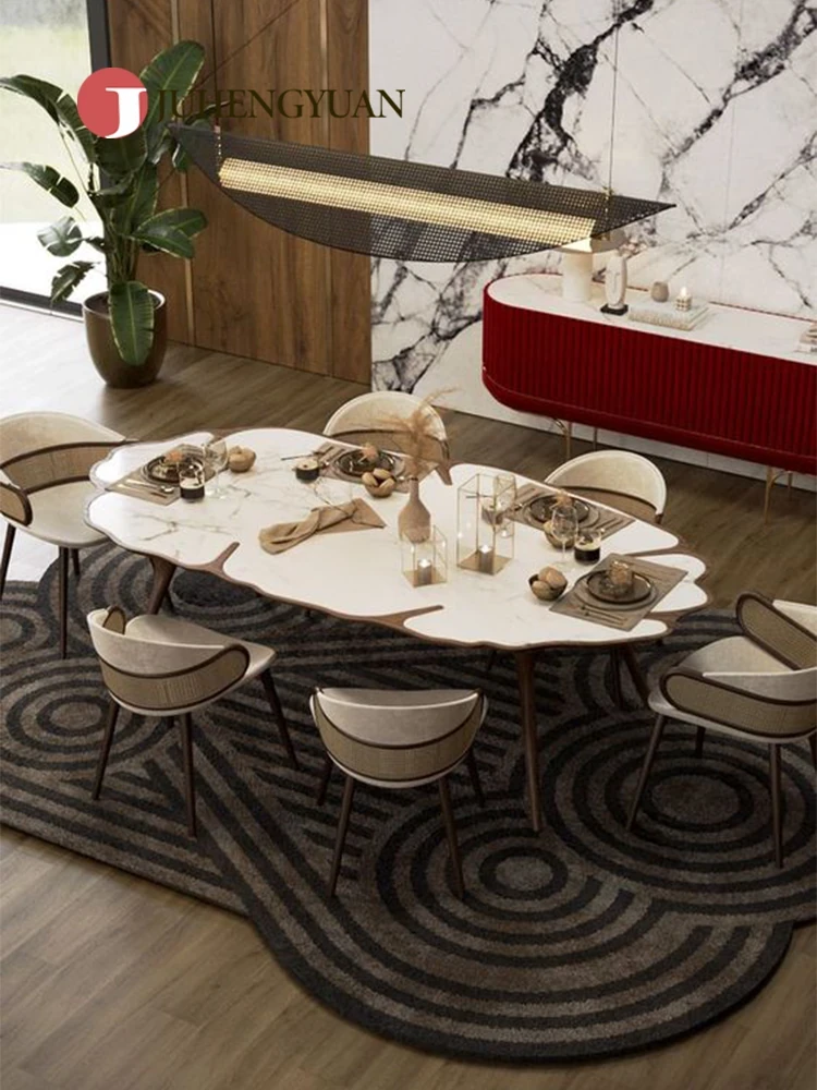 JUHENGYUAN Italian Minimalist Marble Dining Table - Luxury Walnut Solid Wood Dining Table for Large Spaces, Unique Shape