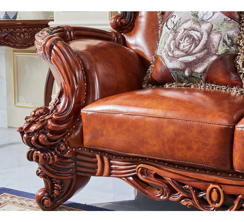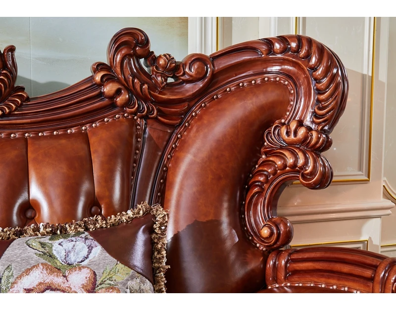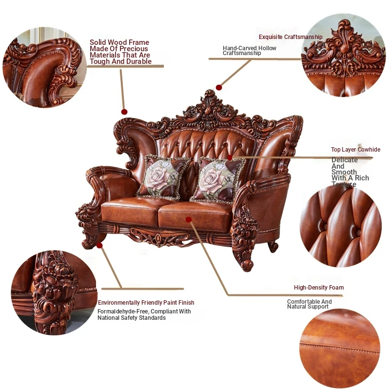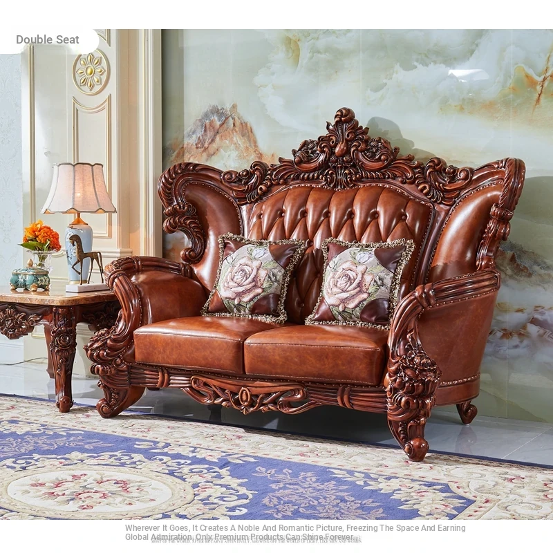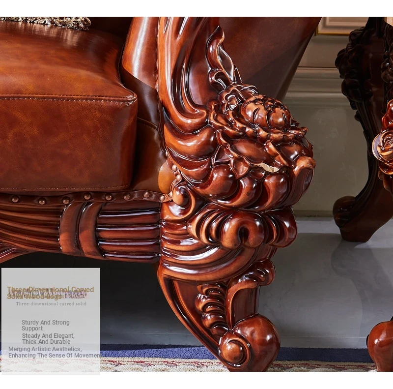 Luxurious European-style Genuine Leather Sofa Set - High-Quality Top Grain Leather with Exquisite Solid Wood Carvings for Spacious Villas and Large Living Rooms - 124 Combination