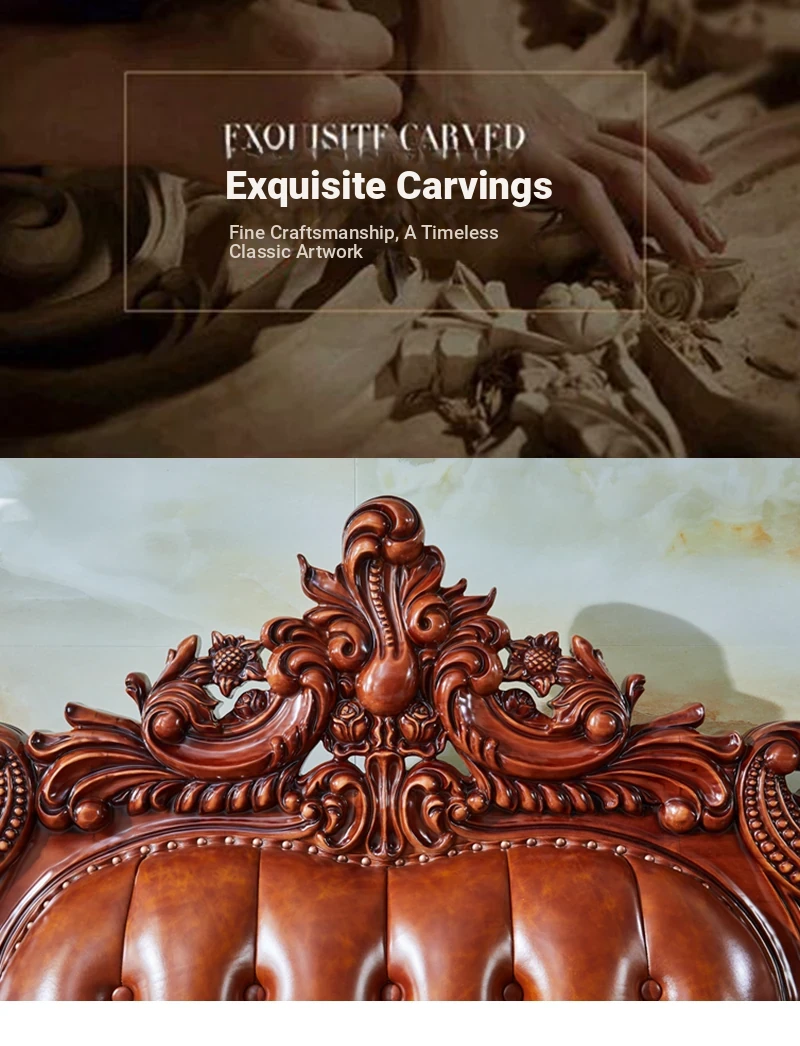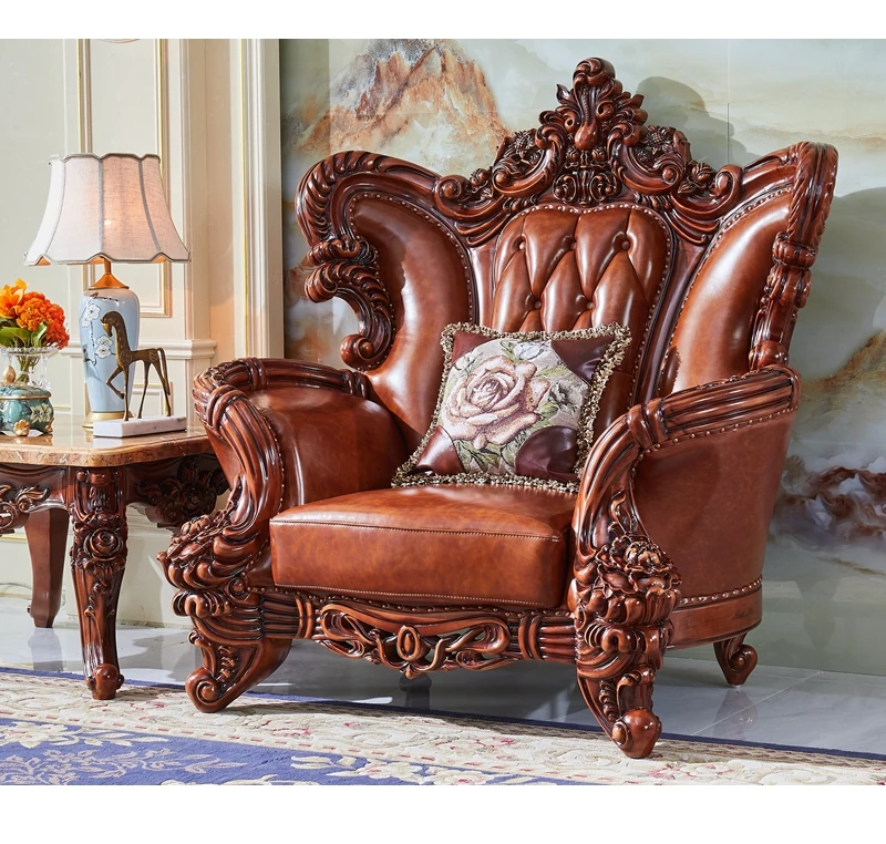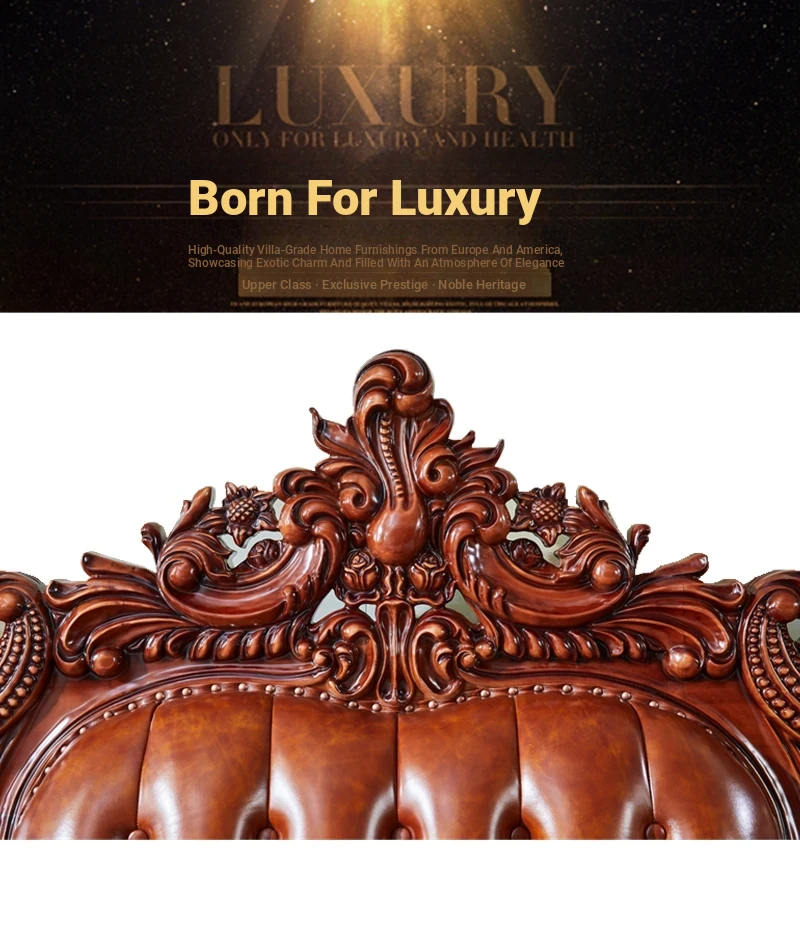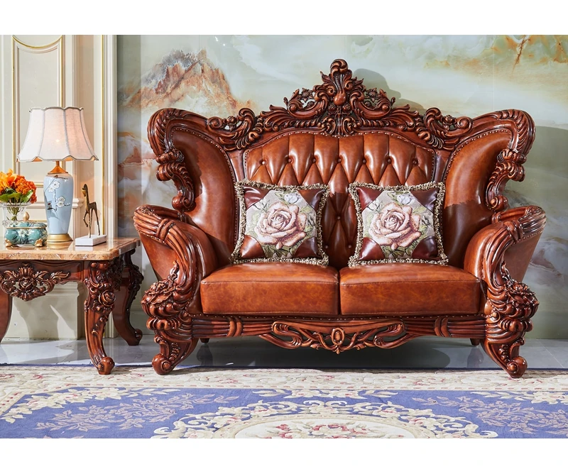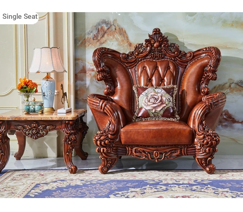 Luxurious European-style Genuine Leather Sofa Set - High-Quality Top Grain Leather with Exquisite Solid Wood Carvings for Spacious Villas and Large Living Rooms - 124 Combination