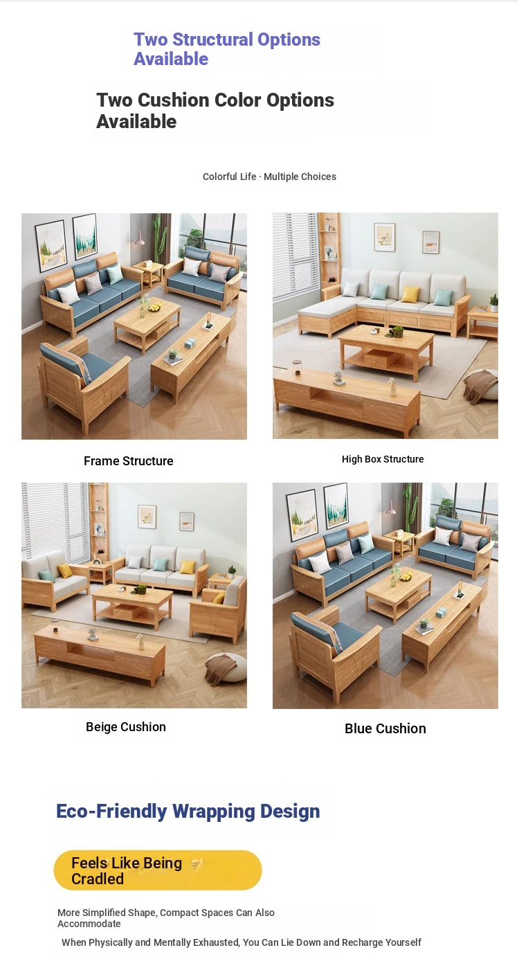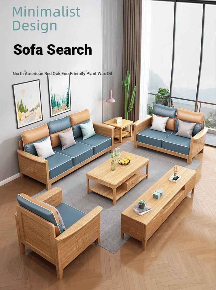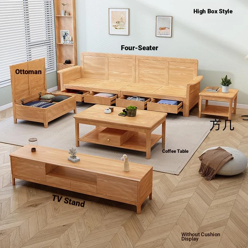 North American Red Oak Sofa Storage High-Box Solid Wood Corner Three-Seater Sofa with TV Cabinet and Coffee Table Set, Finished with Natural Wax Oil