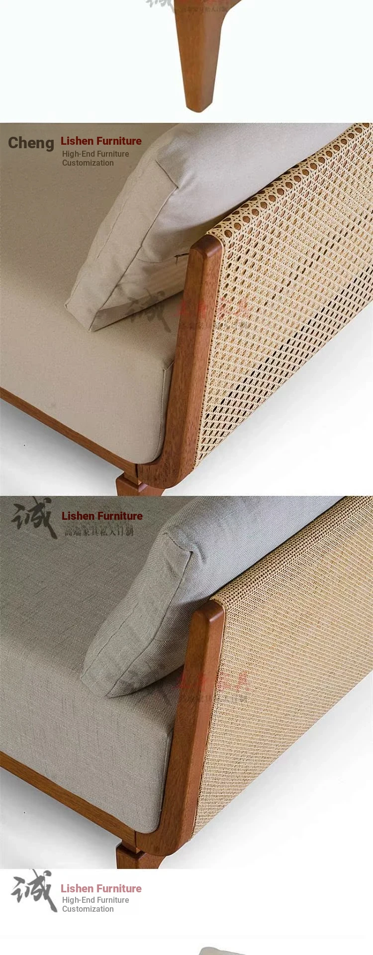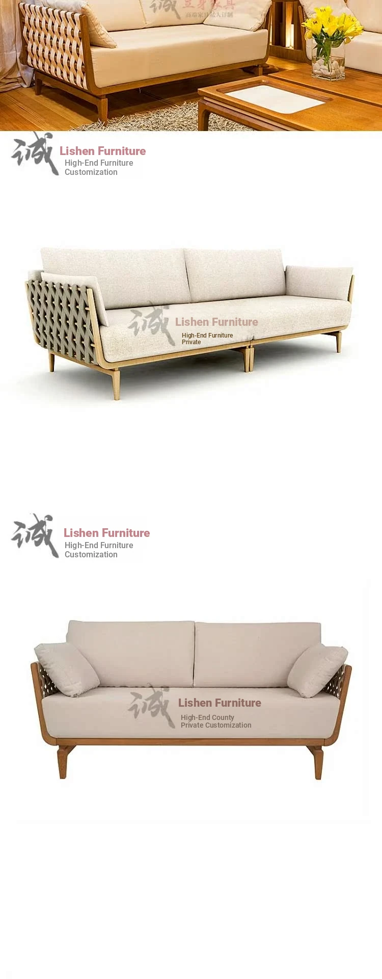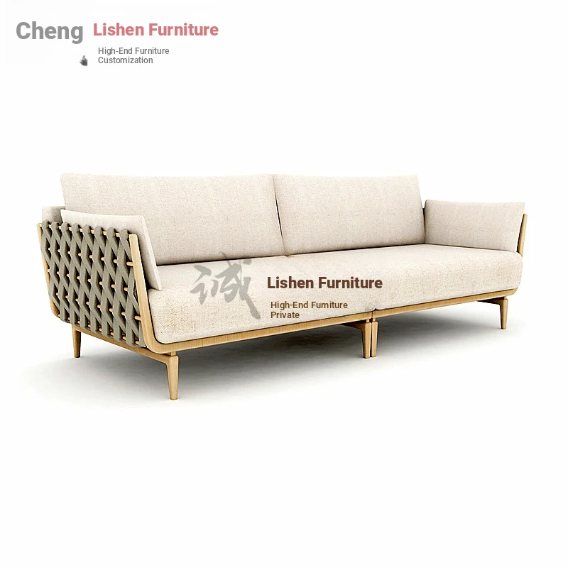 Rope-Woven Italian Rattan American-Style Fabric Sofa - Solid Wood, Natural Finish, Modern Chinese Design, Trendy New Release
