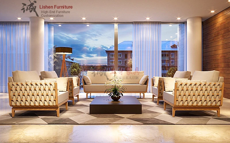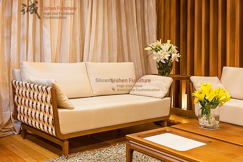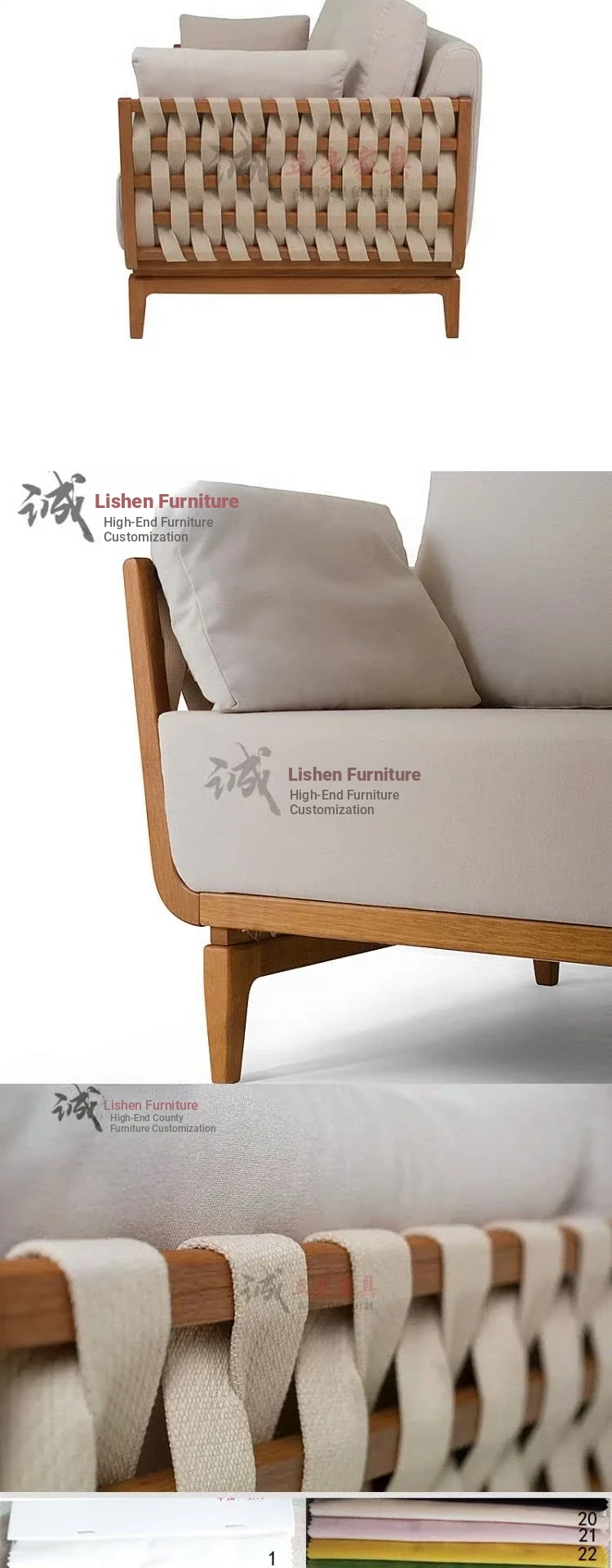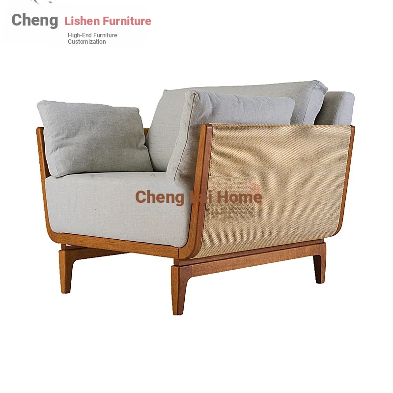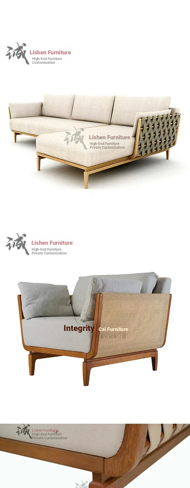 Rope-Woven Italian Rattan American-Style Fabric Sofa - Solid Wood, Natural Finish, Modern Chinese Design, Trendy New Release