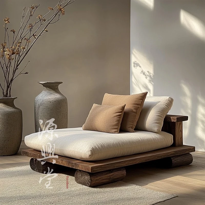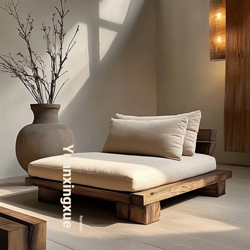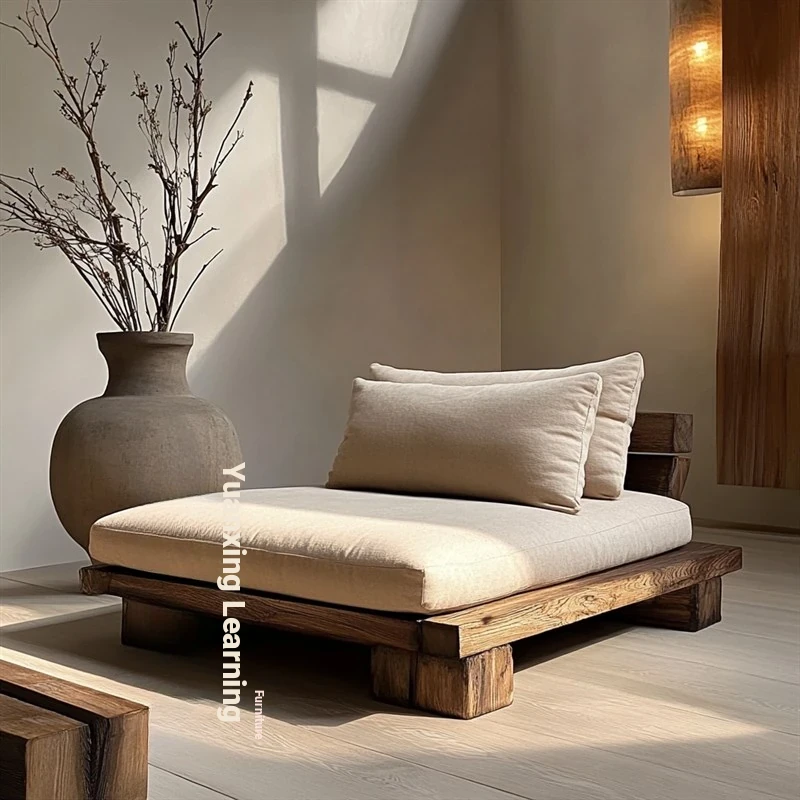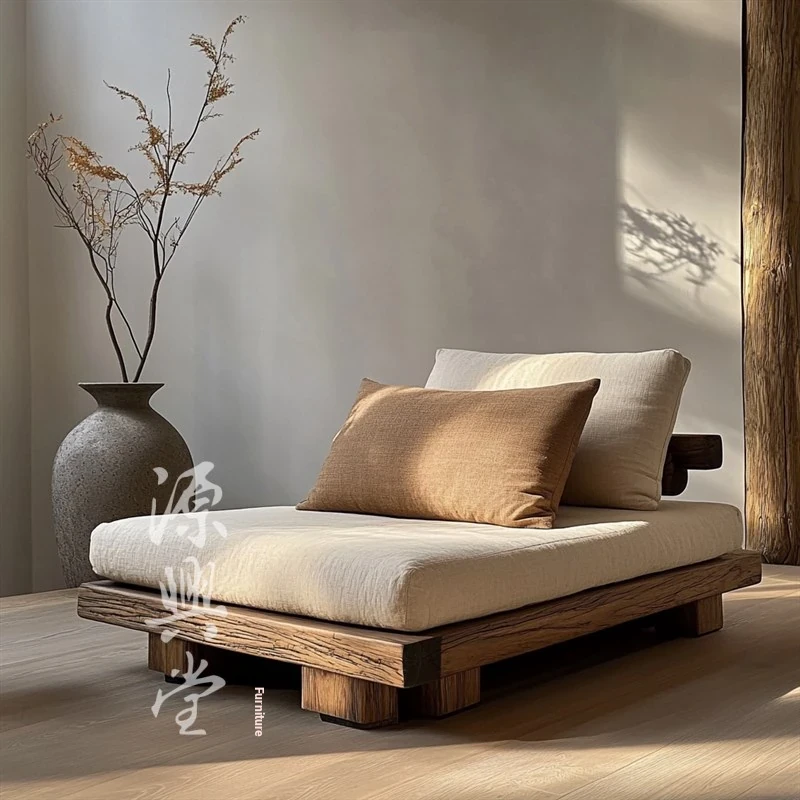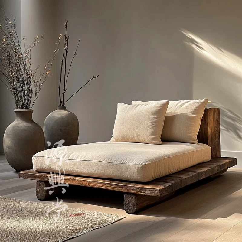Wabi-Sabi Aesthetic Chaise Lounge Chair - Elegant Single Sofa, Compact Lazy Bed for Reading or Relaxing, Crafted from Solid Wood
