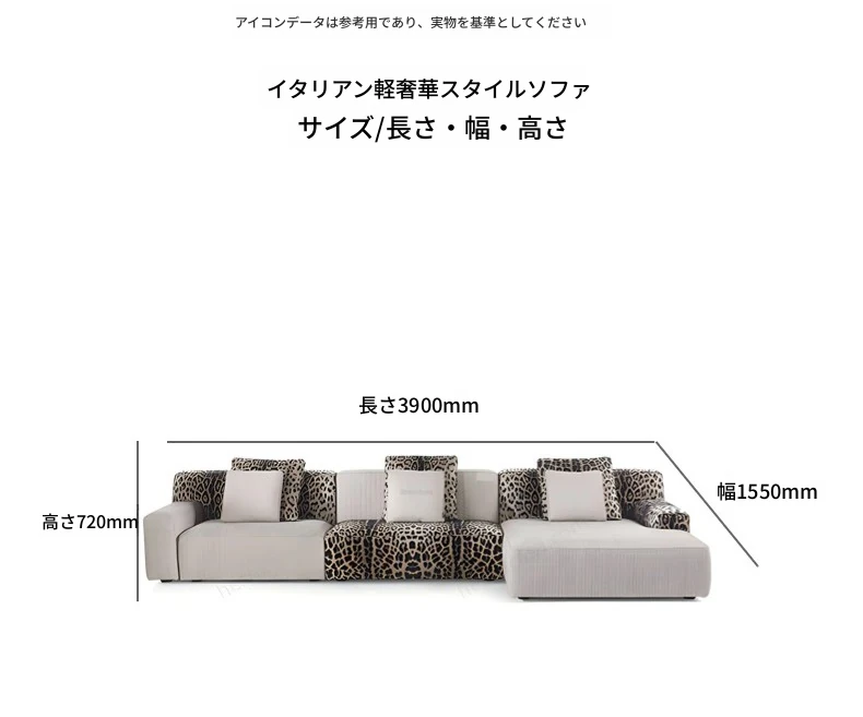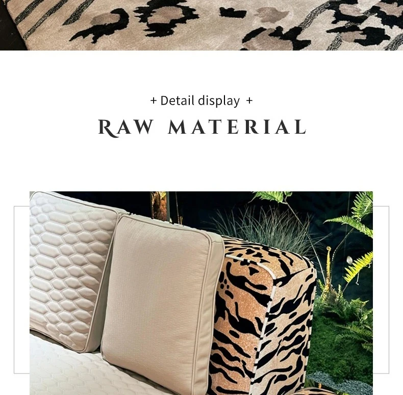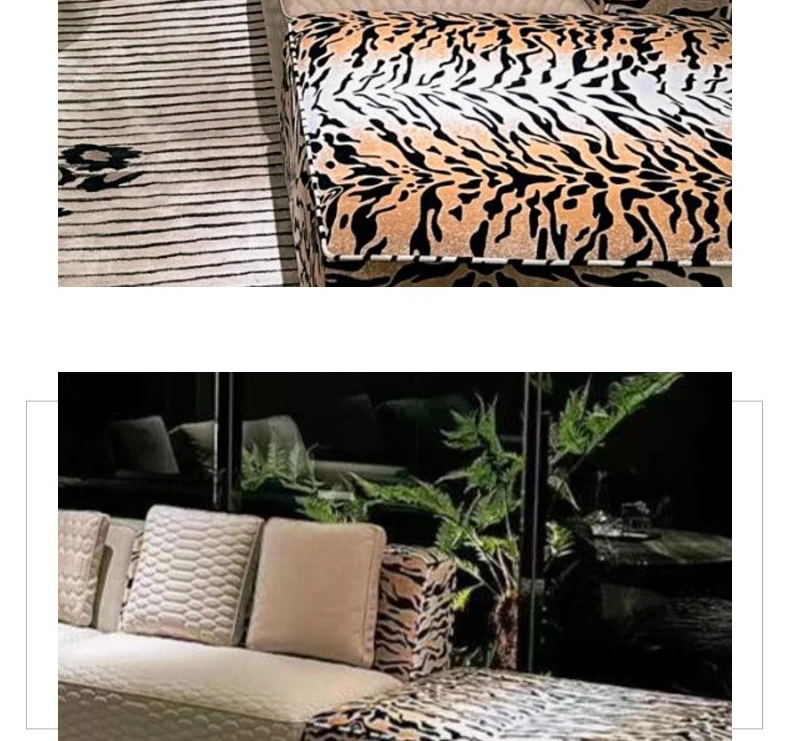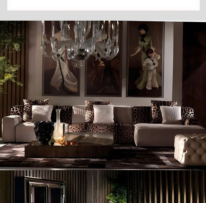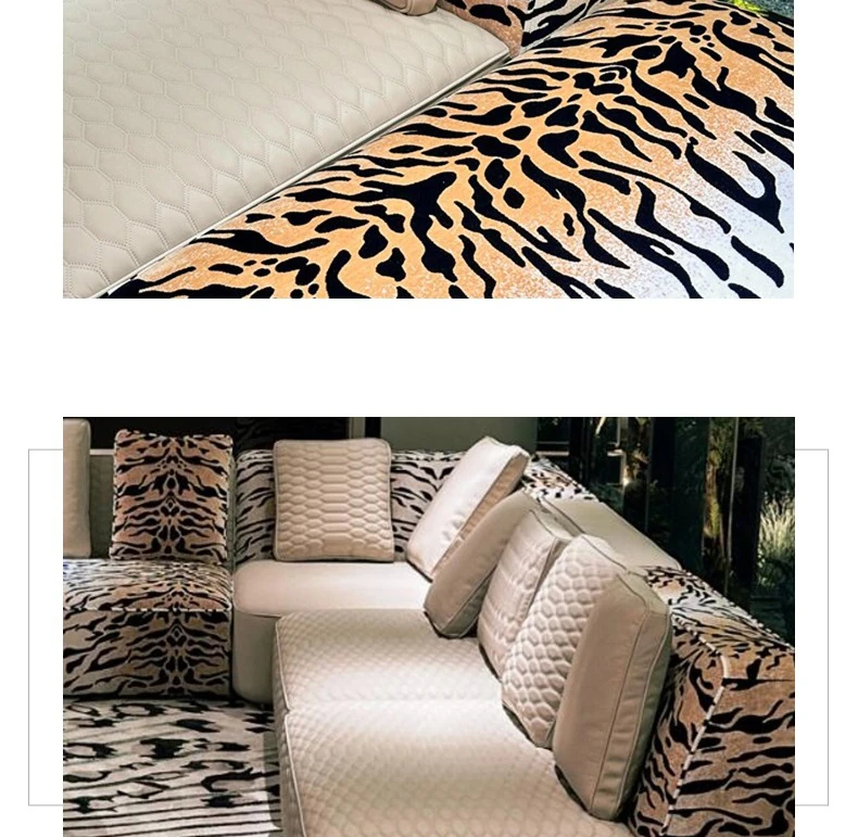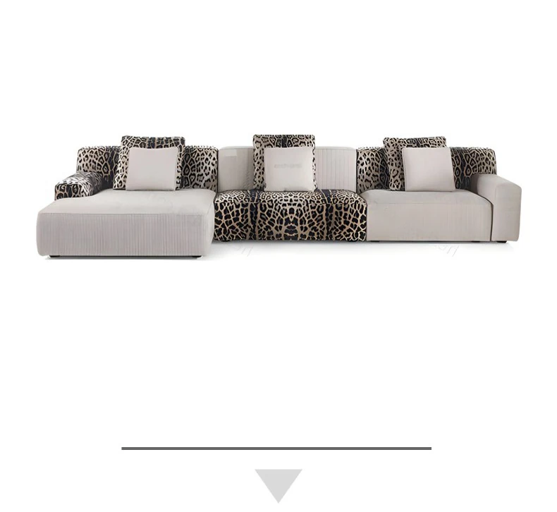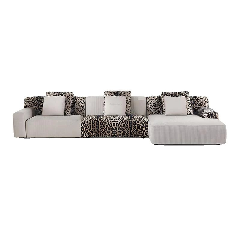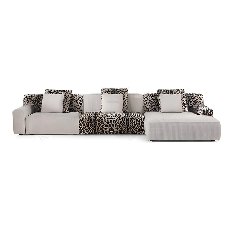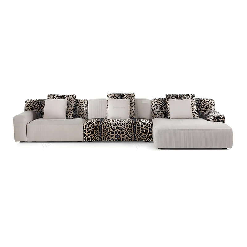 2024年新作!イタリアンラグジュアリー本革ソファー – ヴィラのリビングにぴったりな角型ヒョウ柄ファブリック・マルチモジュールソファ!洗練されたデザインと快適さを兼ね備えた、あなたの空間を格上げする一品。