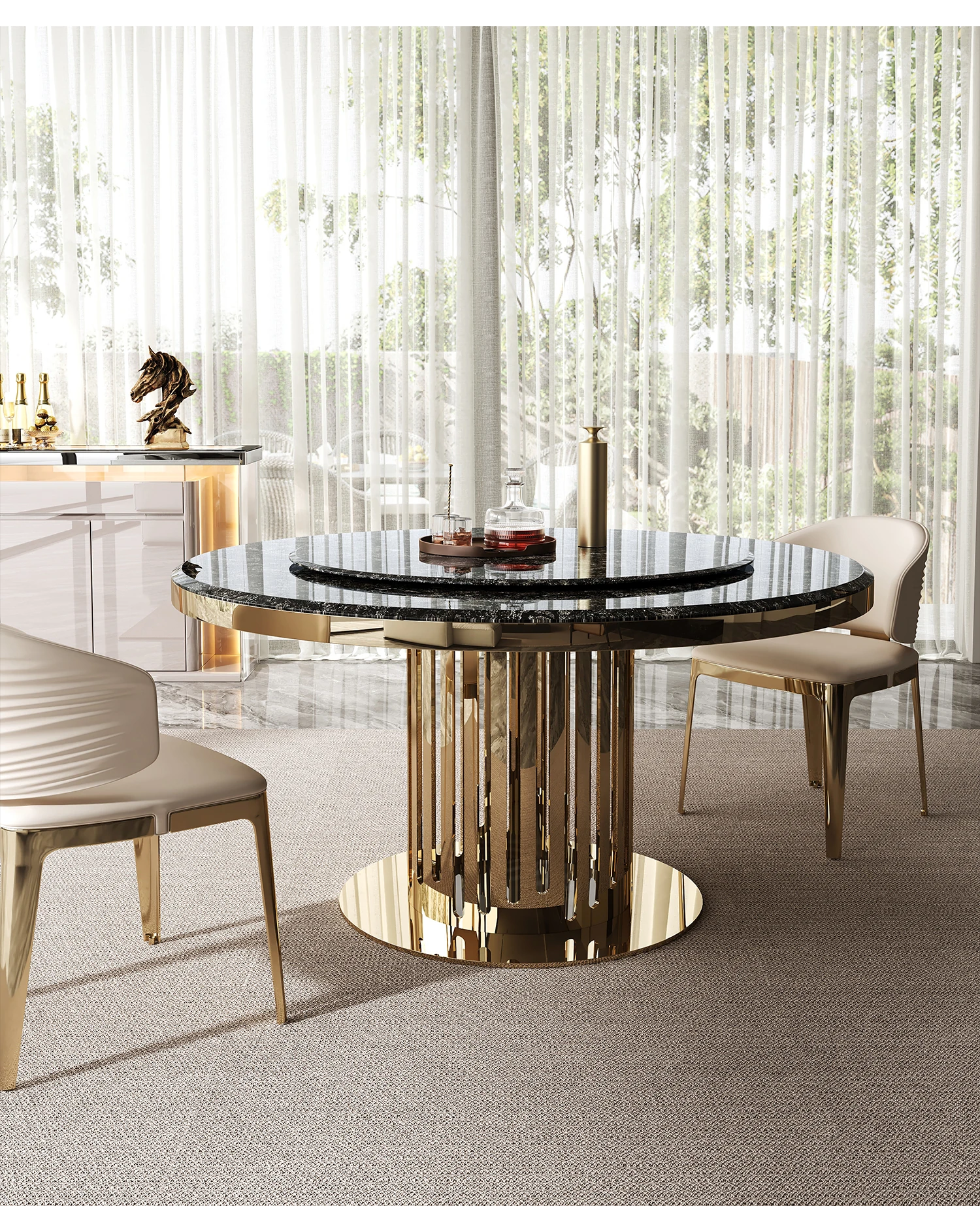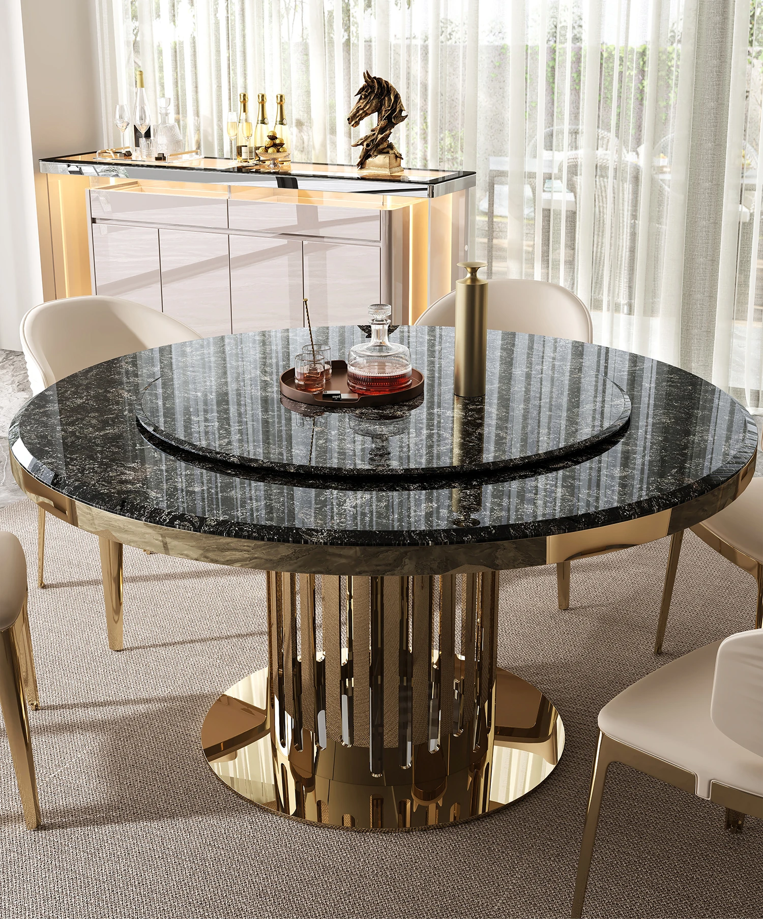 1.35メートル/プラチナダイヤモンド大理石ダイニングテーブル + 回転台 + 4脚のラグジュアリーなダイニングチェア
