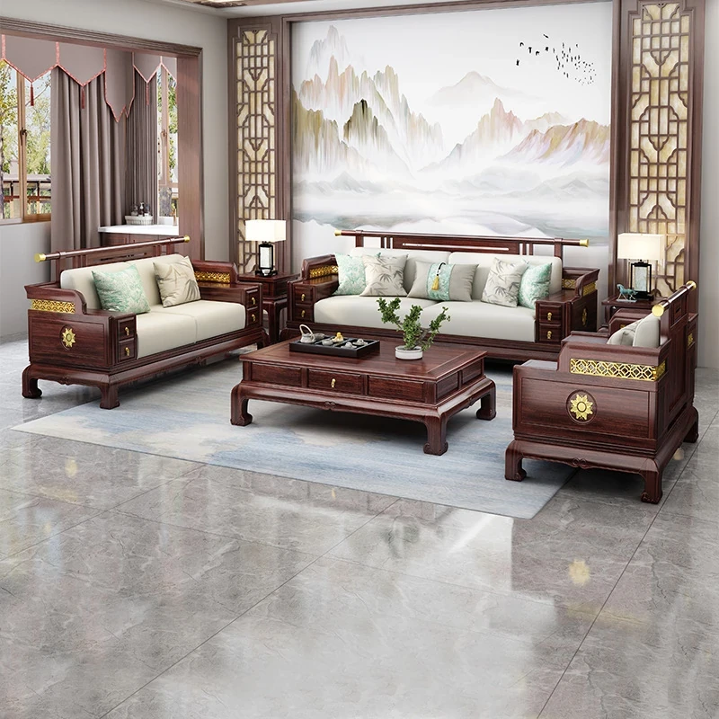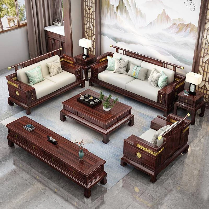 新型中式ウッディーウールブラックソファーセット - コンパクト&ラージサイズ対応、冬夏兼用のアンティークスタイル、現代的なデザインでおしゃれな生活空間を演出!6511#