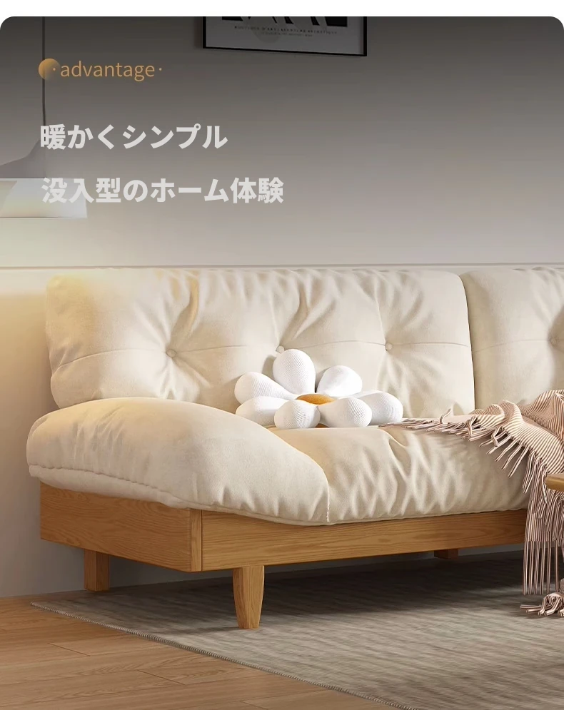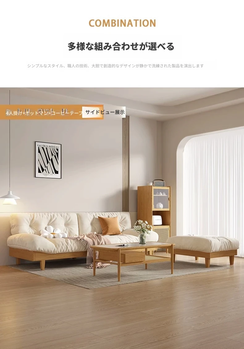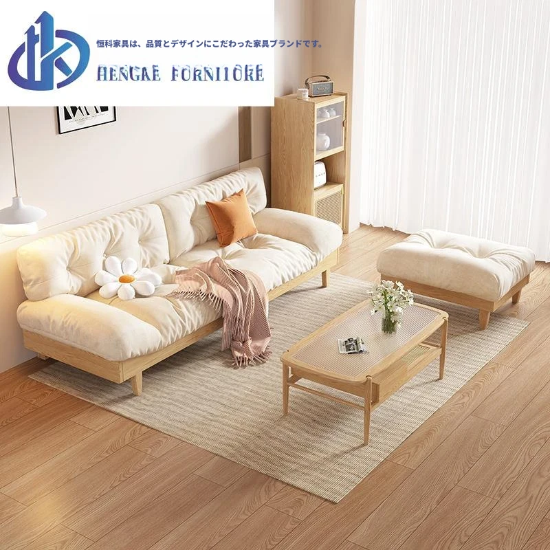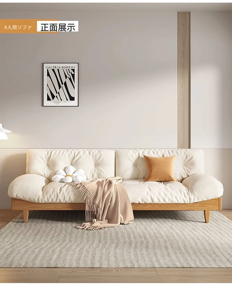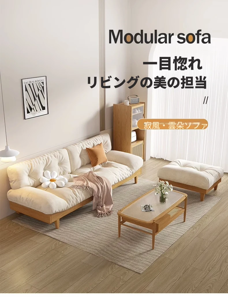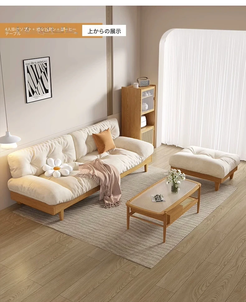 ホワイトアッシュの和風侘寂スタイル、雲のようなデザインのクリームホワイトソファ。高級天然木とテクスチャー感のあるファブリックを使用した実木コンビネーションソファで、快適さと美しさを両立。お部屋を優雅に彩ります!