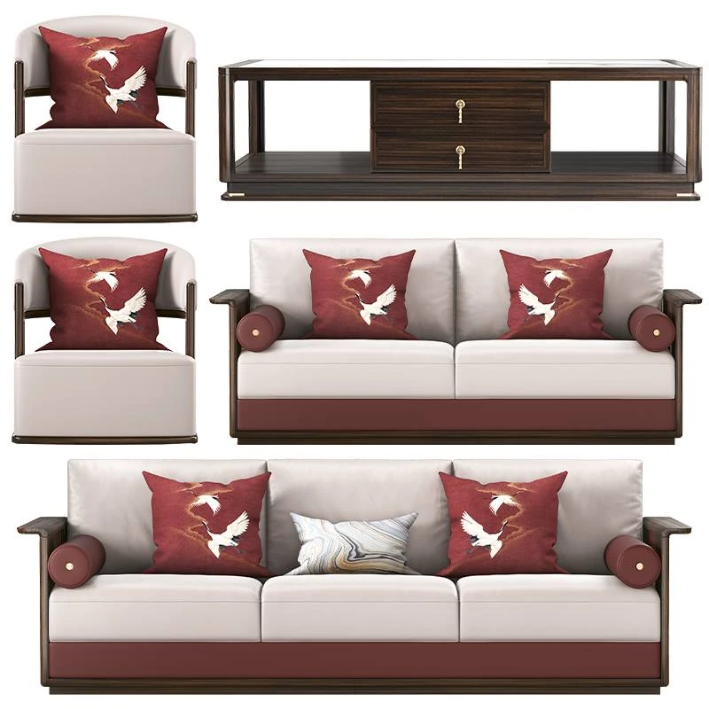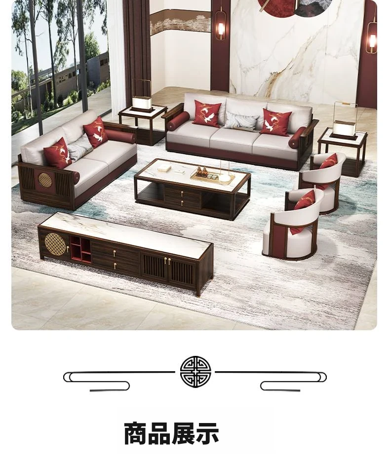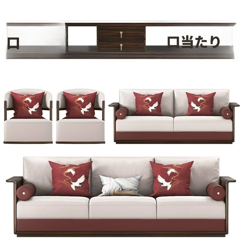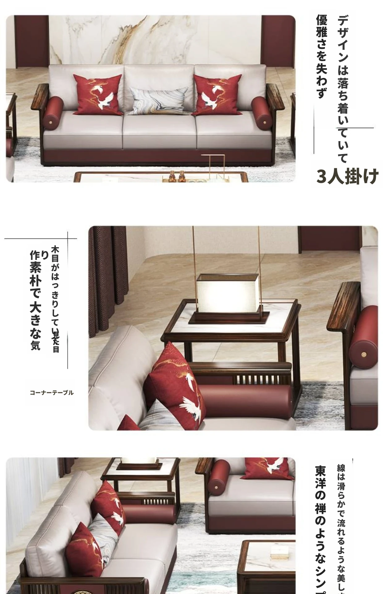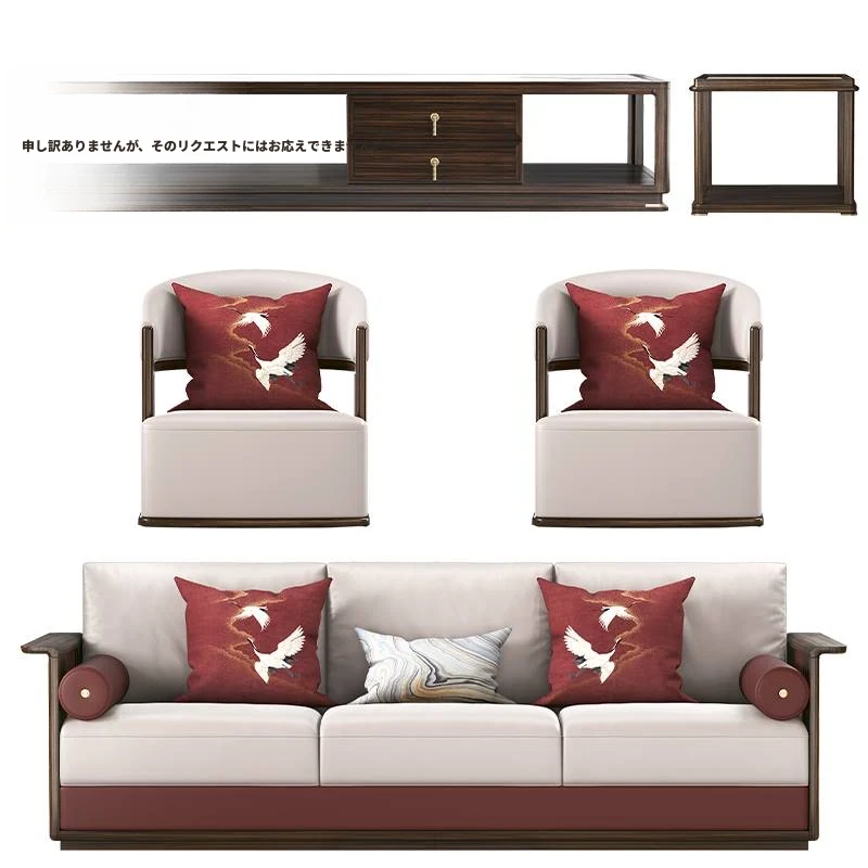 デザイナー新中式ウーキン木製ソファセット 豪華なヴィラ用リビング 広々とした高級本革&無垢材家具 贅沢な空間を演出!