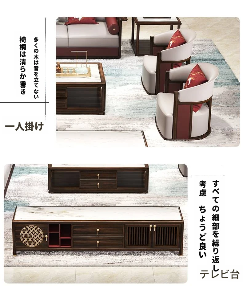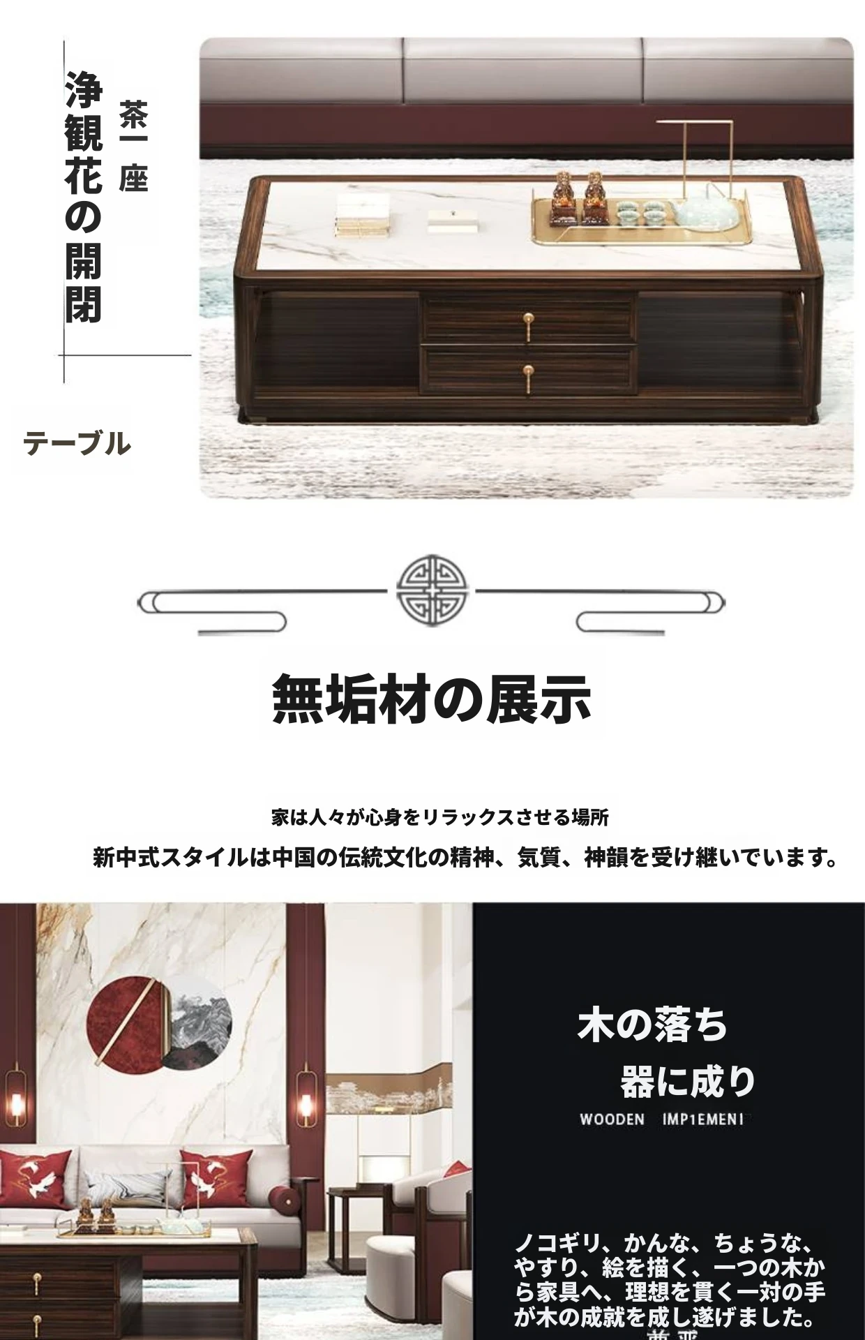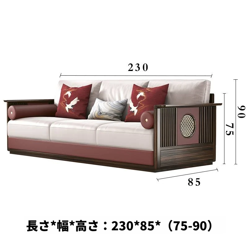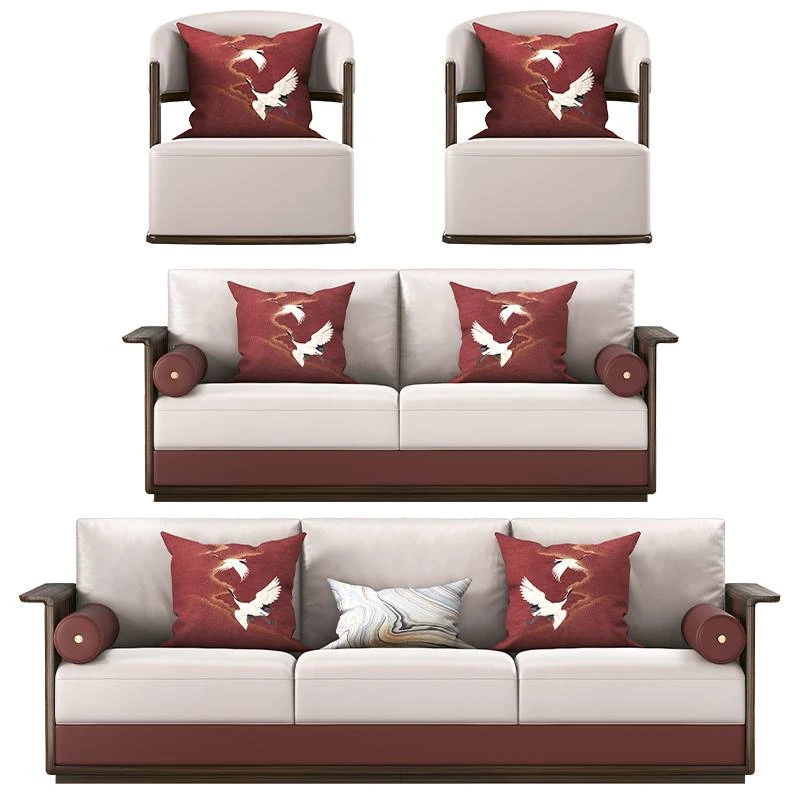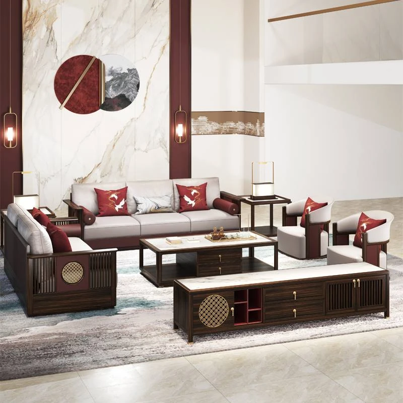 デザイナー新中式ウーキン木製ソファセット 豪華なヴィラ用リビング 広々とした高級本革&無垢材家具 贅沢な空間を演出!