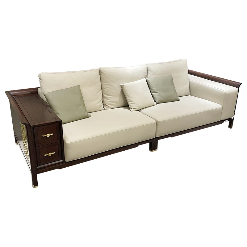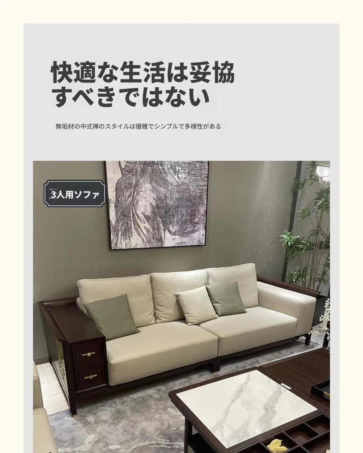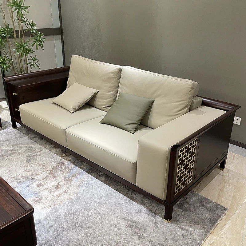 新中式エボニー木製ソファ - ラグジュアリーな客間に最適な禅スタイル、中国風の別荘にぴったりな布張り実木レザーコンビネーションソファ!快適さと美しさを兼ね備えた贅沢な一品。