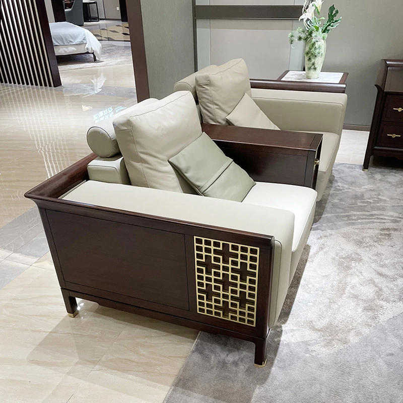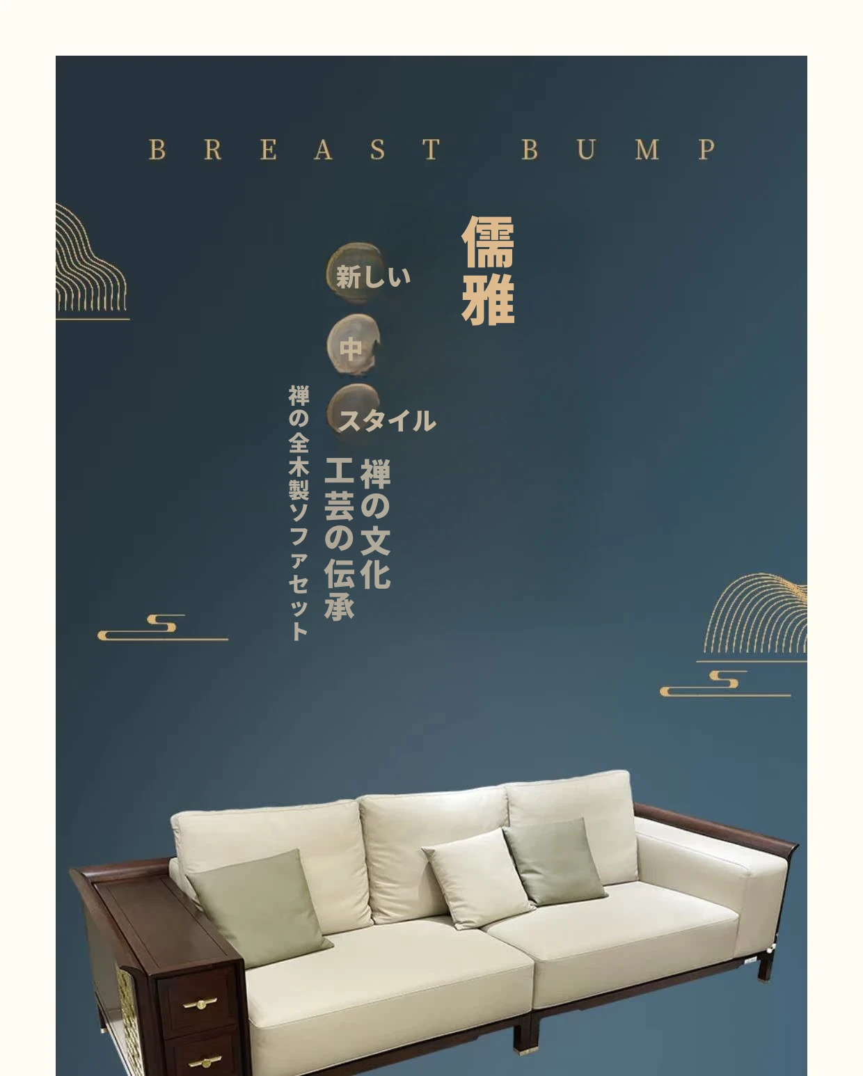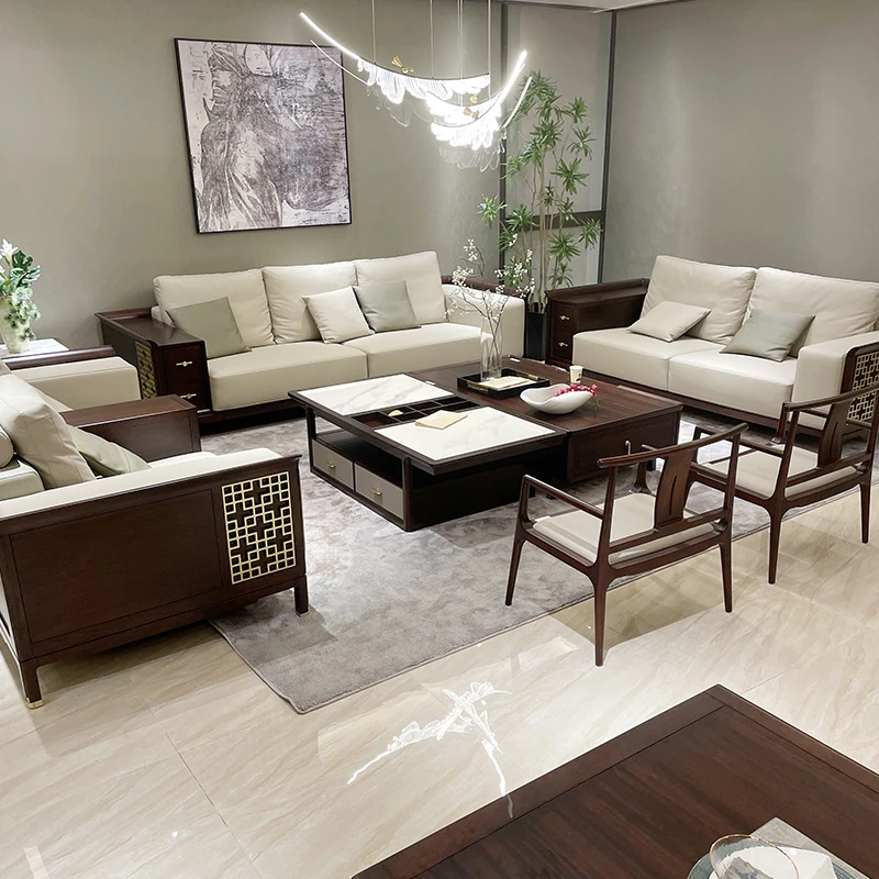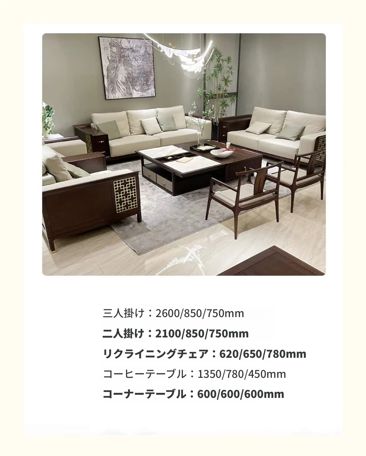 デザイナー新中式無垢材ソファセット|現代的な高級別荘のリビングや広さに合わせた中国風民宿の禅スタイル。上質な素材で心地よい空間を演出します!