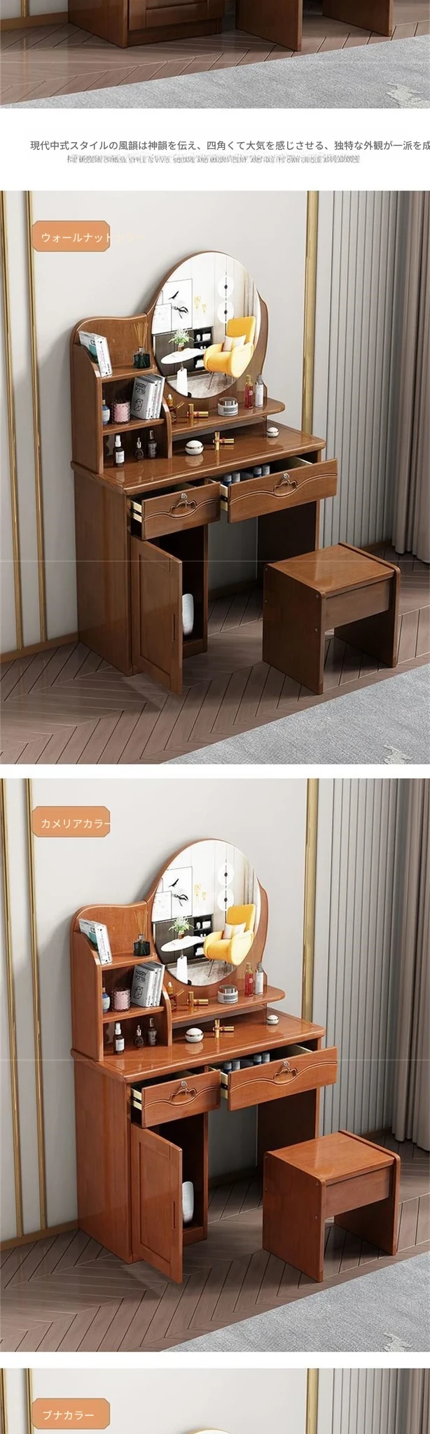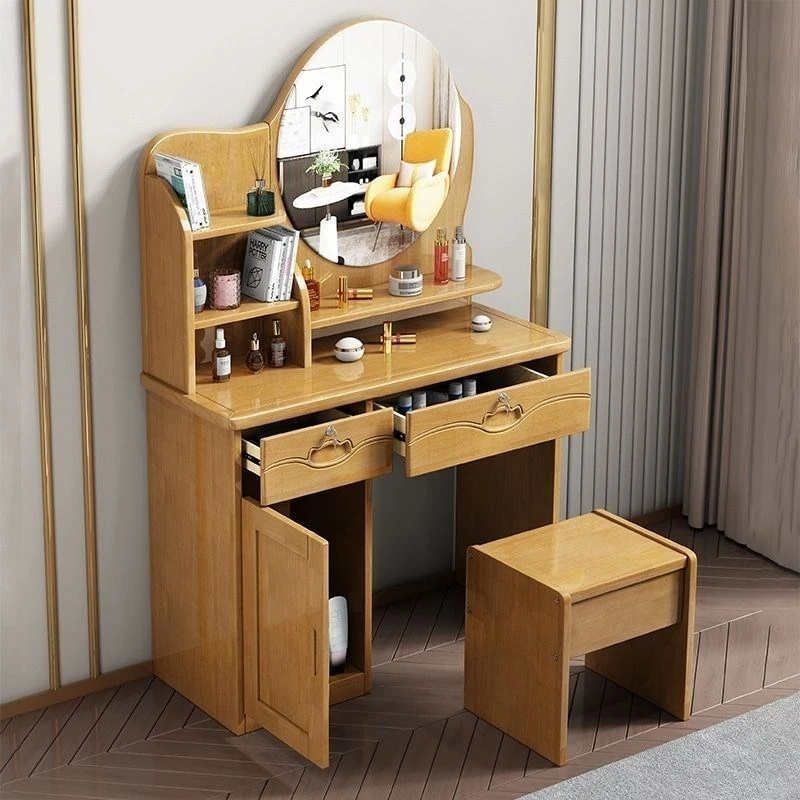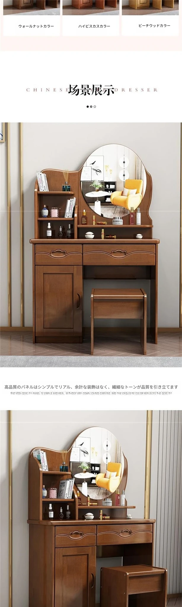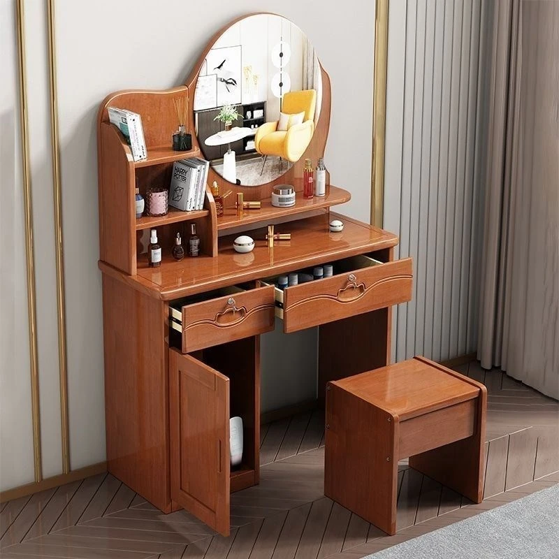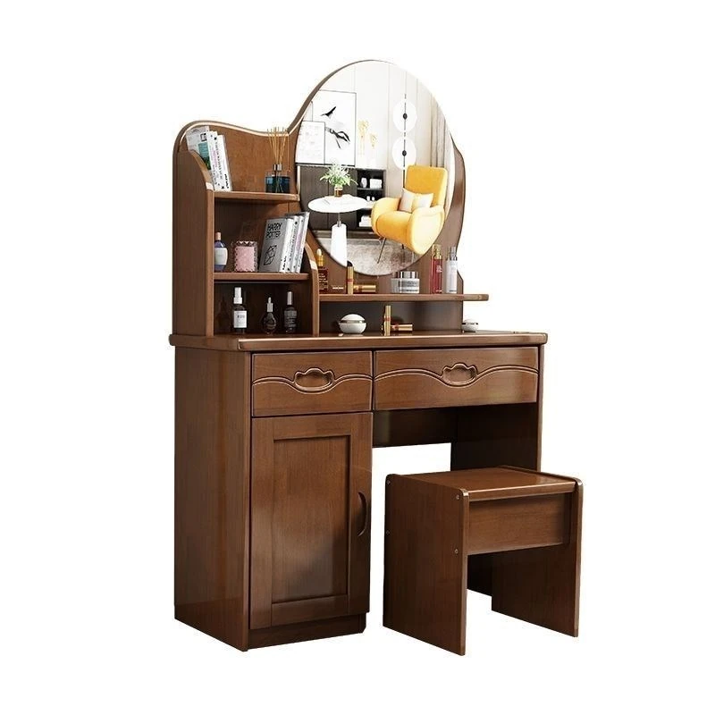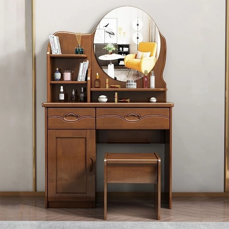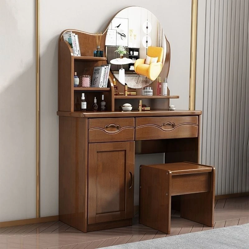 お得な中式実木製ドレッサー、椅子付き!小スペースに最適なシンプルで多機能な収納キャビネット、主寝室用メイクミラー付き。あなたの美を引き立てるアイテムです!