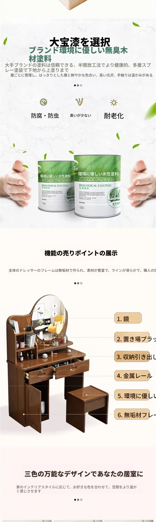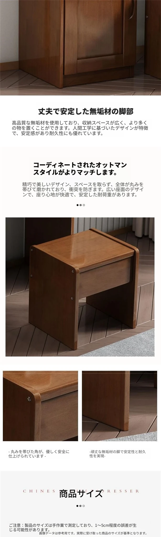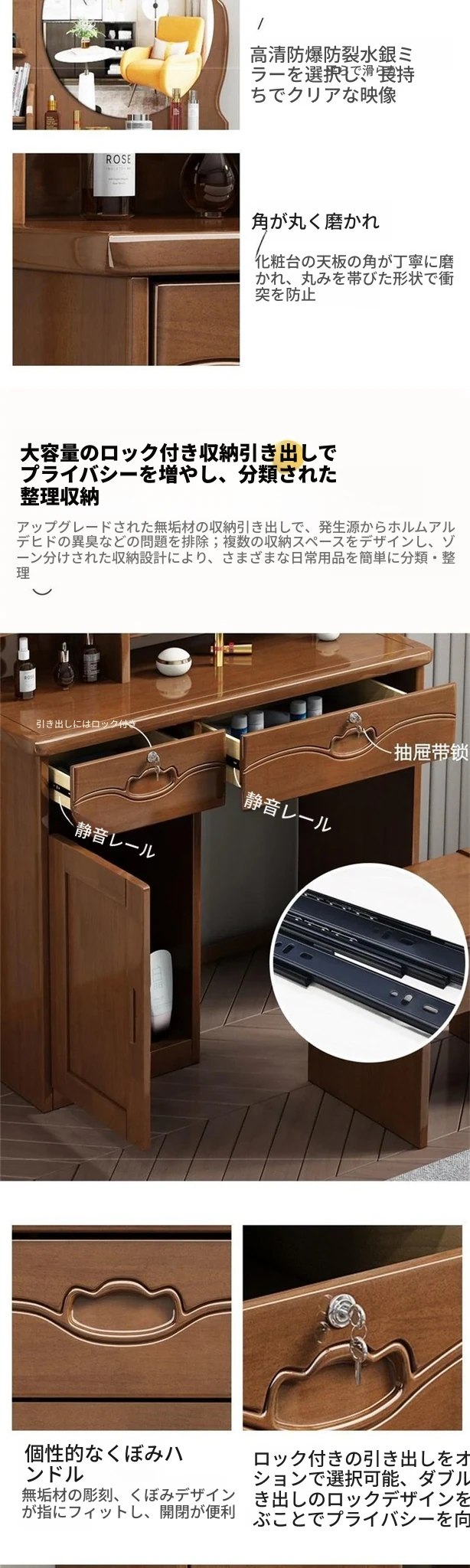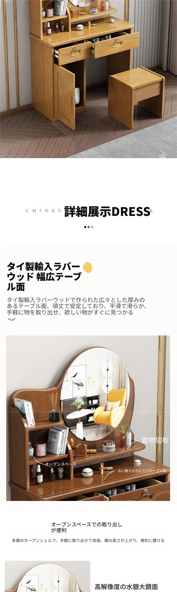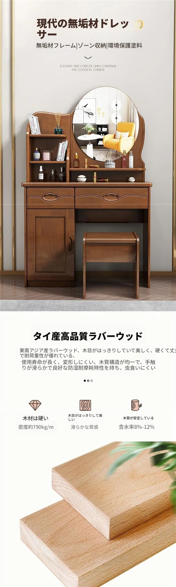 お得な中式実木製ドレッサー、椅子付き!小スペースに最適なシンプルで多機能な収納キャビネット、主寝室用メイクミラー付き。あなたの美を引き立てるアイテムです!