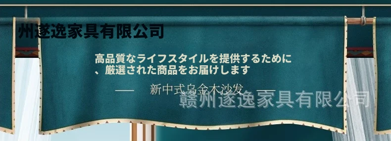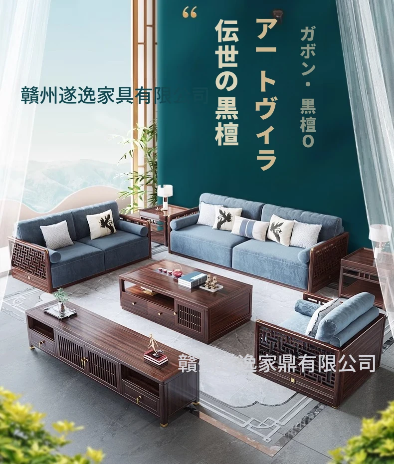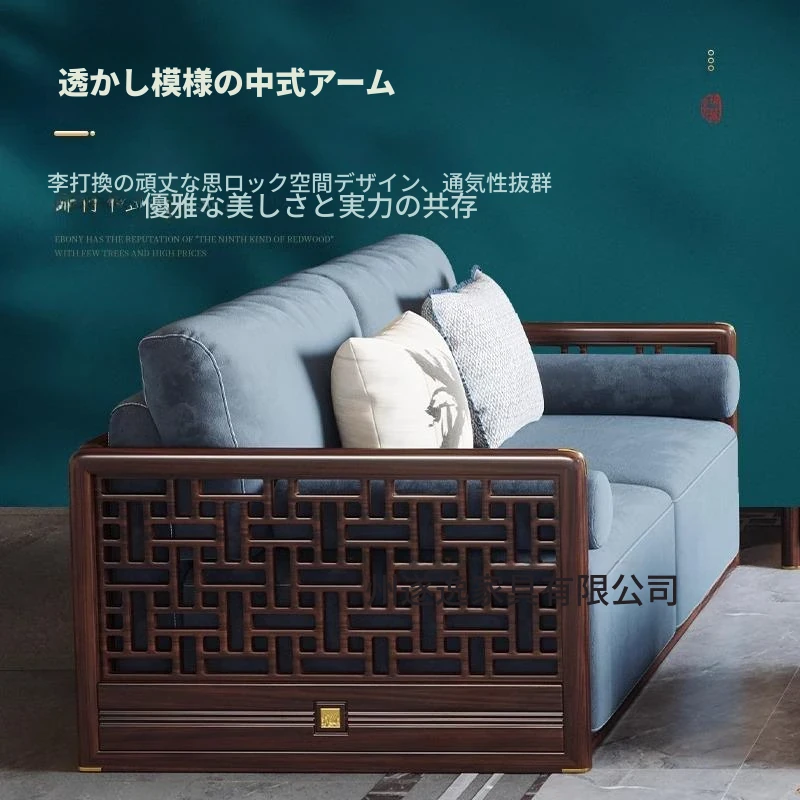 新中式エボニー木製ソファ - ラグジュアリーな客間に最適な禅スタイル、中国風の別荘にぴったりな布張り実木レザーコンビネーションソファ!快適さと美しさを兼ね備えた贅沢な一品。