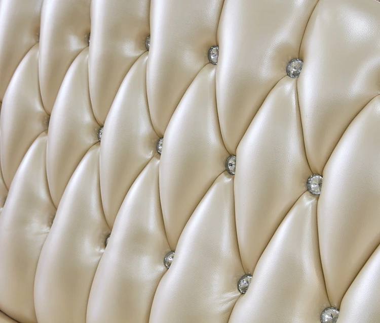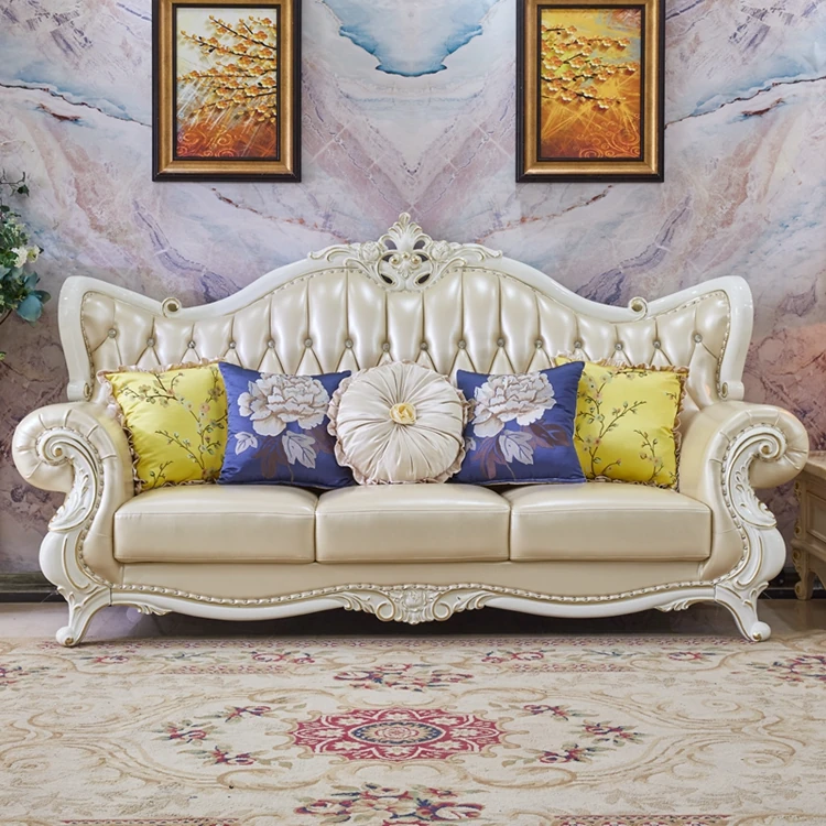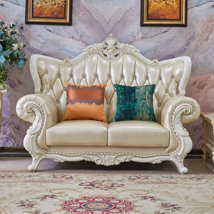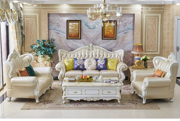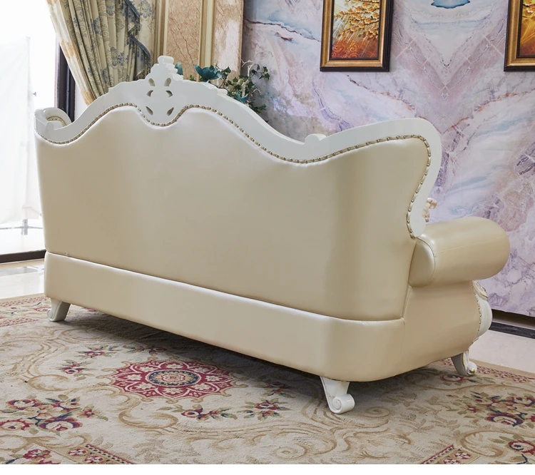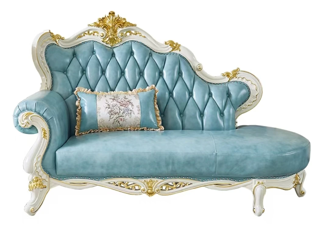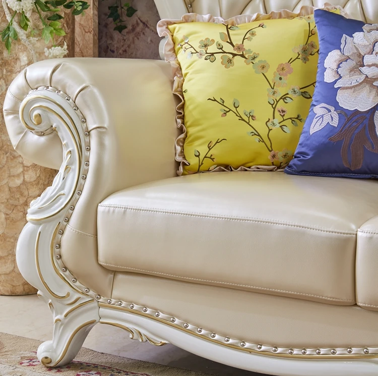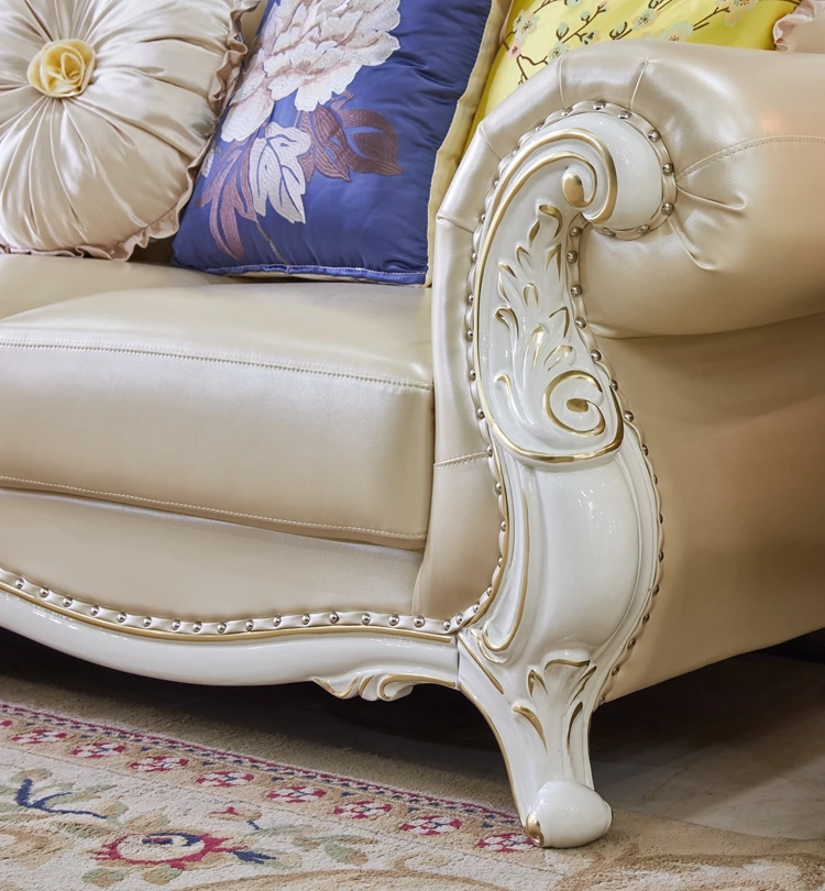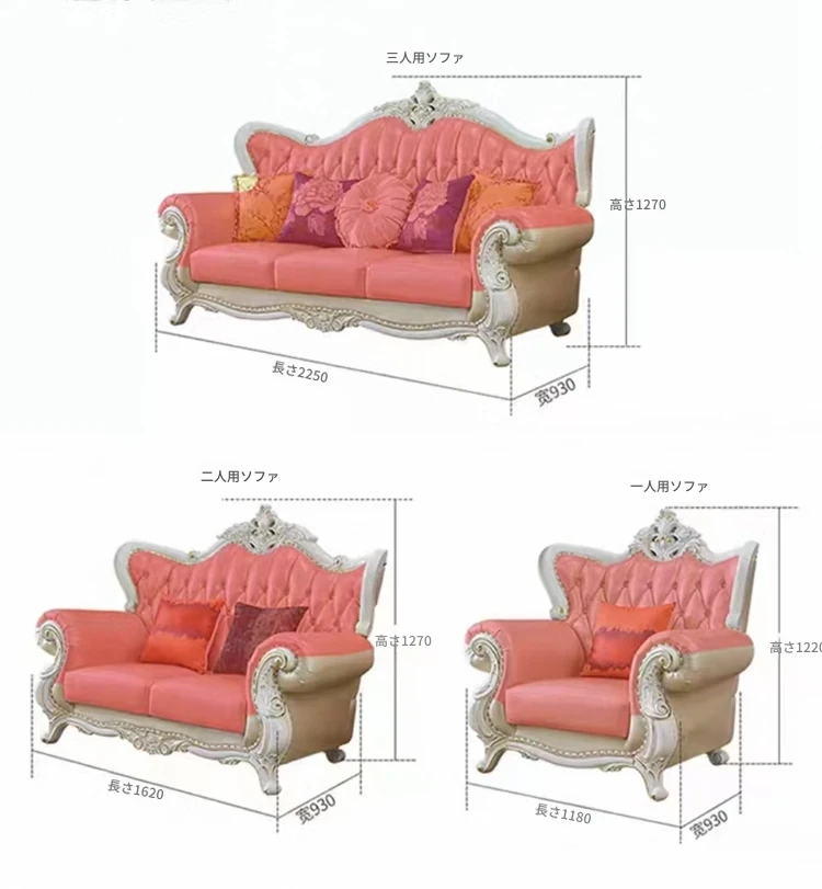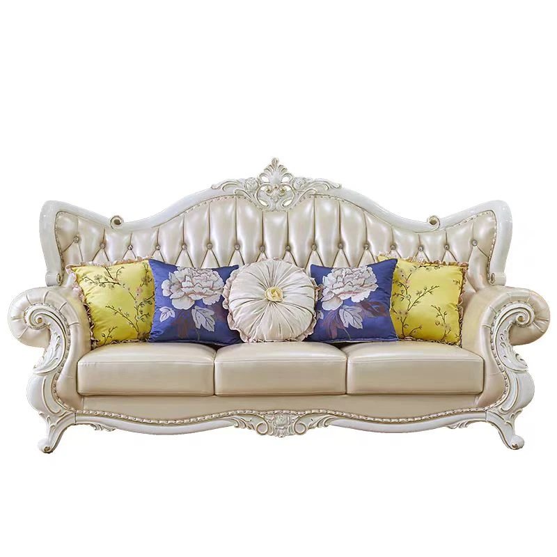 エレガントな欧風全実木レザーソファセット - 中小型リビングにぴったりの彫刻デザイン・軽奢華スタイル・クリーミーな雰囲気の家具一式で、あなたのホームを特別な空間に演出します!