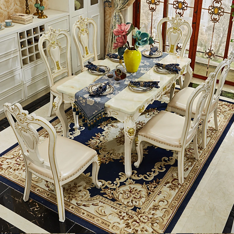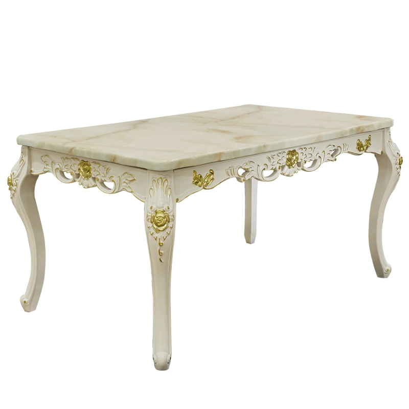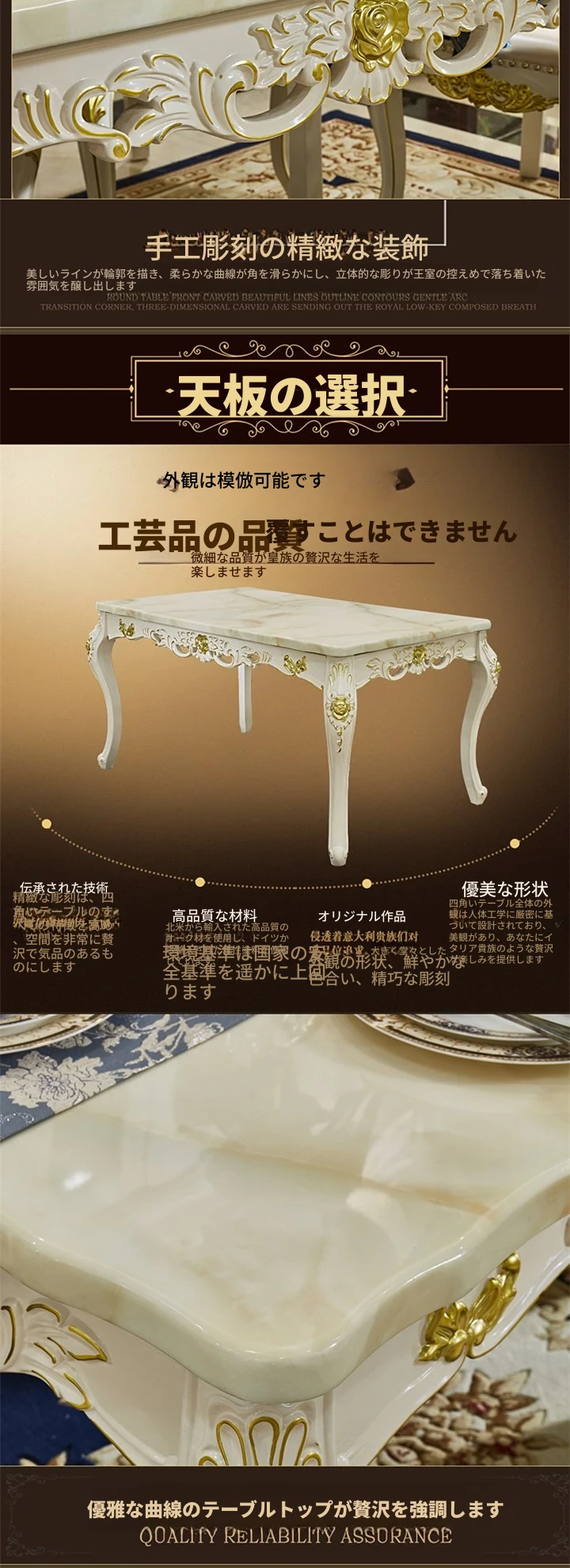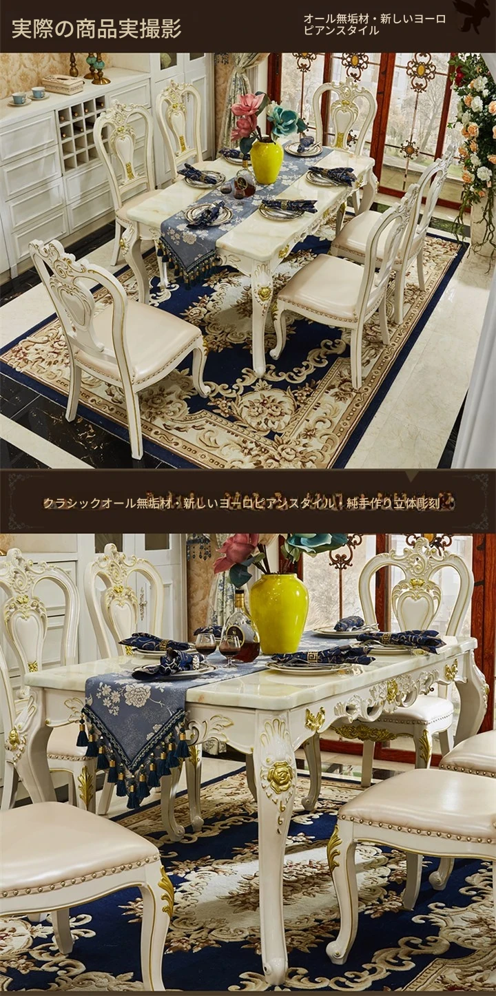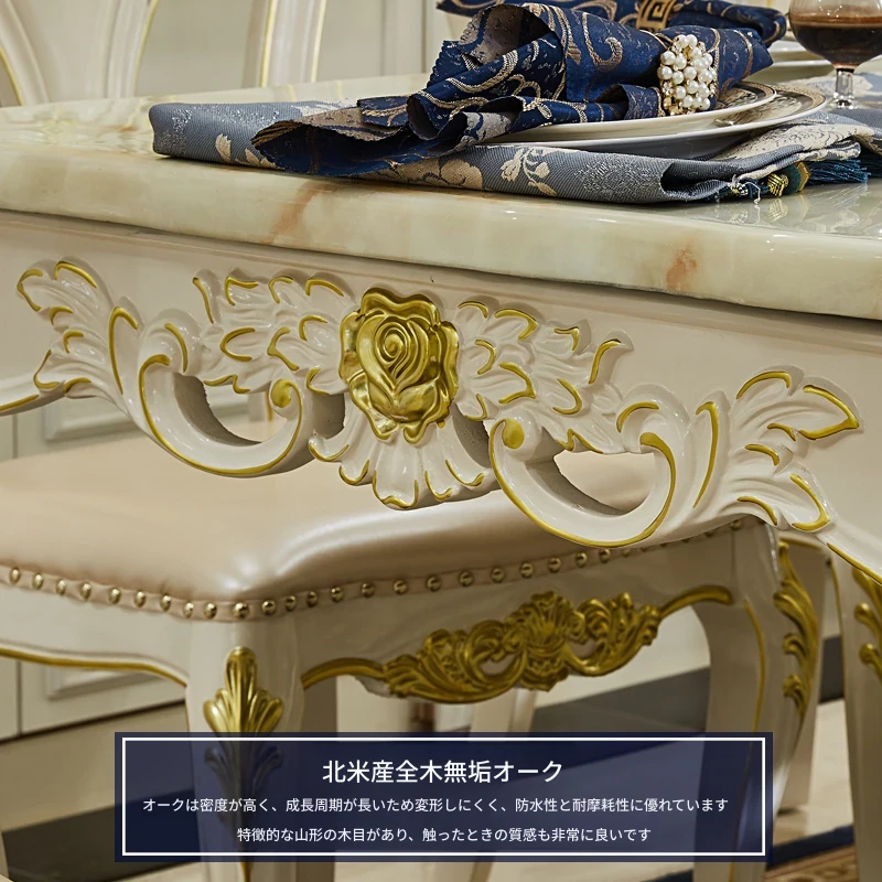 エレガントな欧風デザインの実木製四角テーブル、豪華な大理石天板付き。家庭用にも最適で、高級ホテルやレストランにもぴったりなアメリカンスタイルの彫刻が施された高品質ダイニングテーブル。