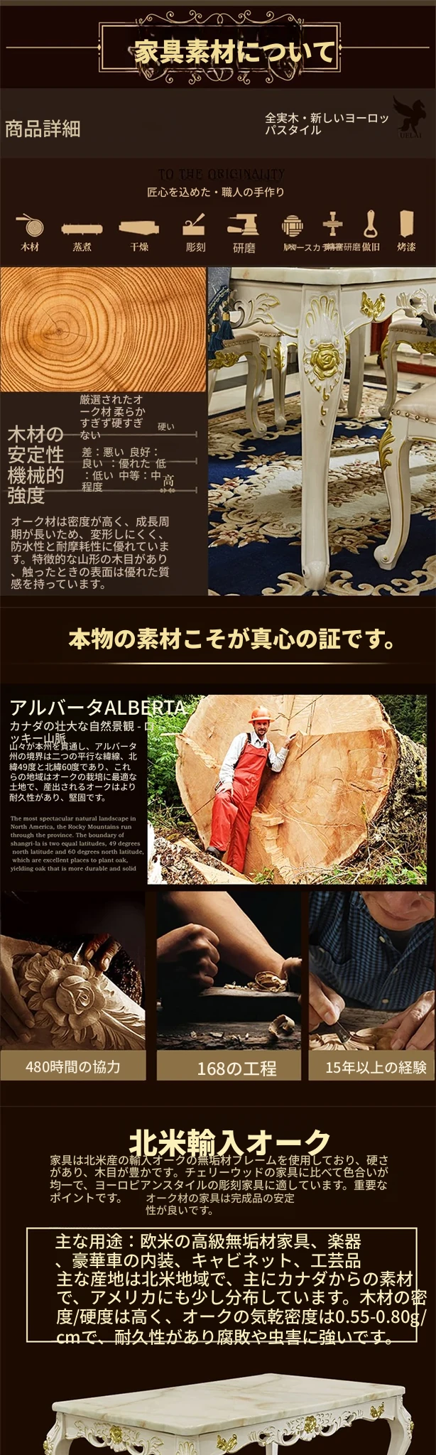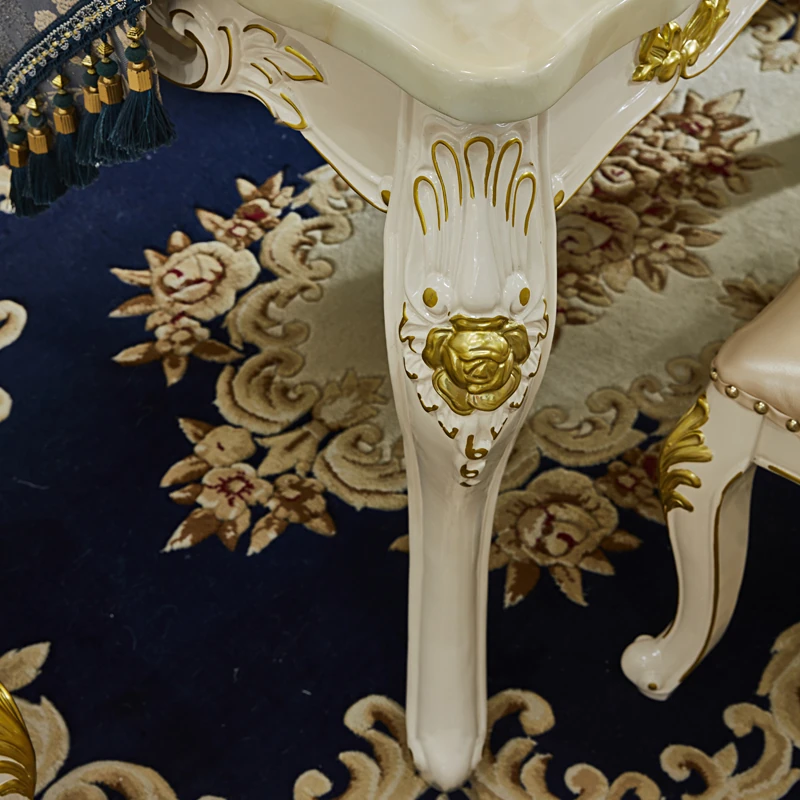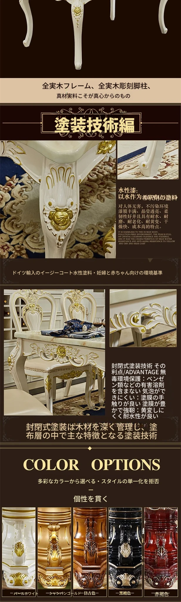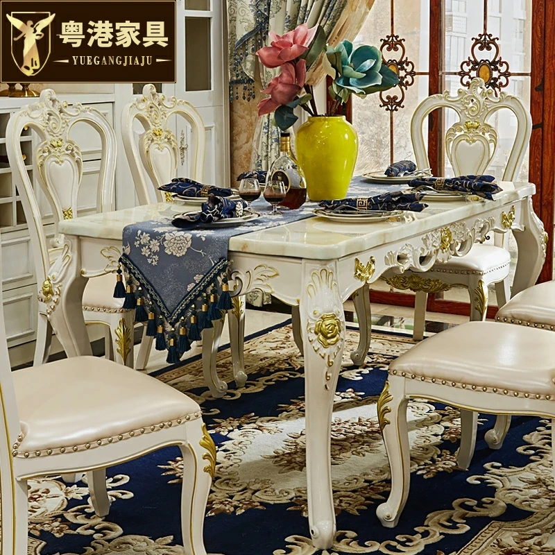 エレガントな欧風デザインの実木製四角テーブル、豪華な大理石天板付き。家庭用にも最適で、高級ホテルやレストランにもぴったりなアメリカンスタイルの彫刻が施された高品質ダイニングテーブル。