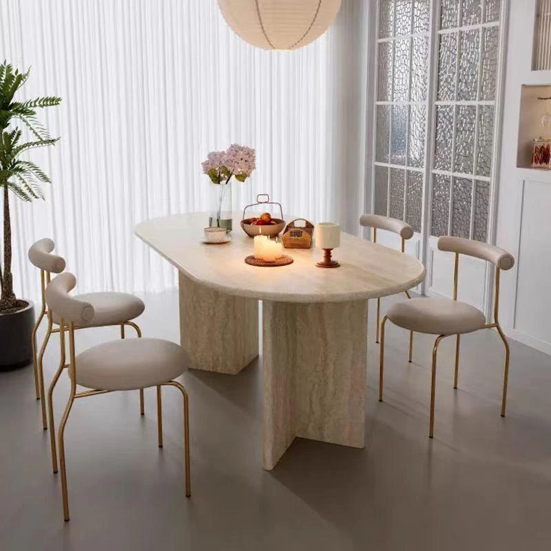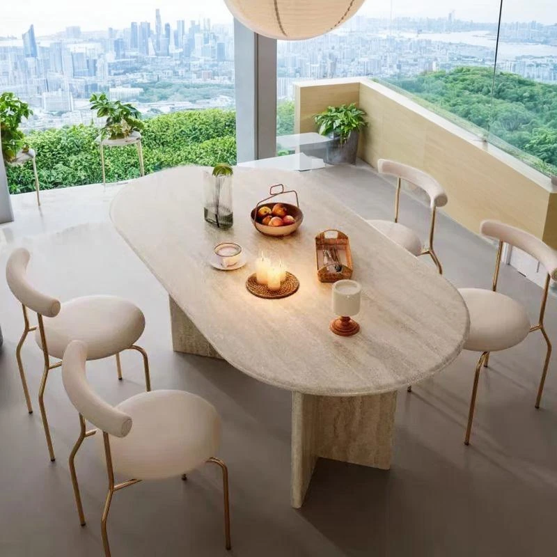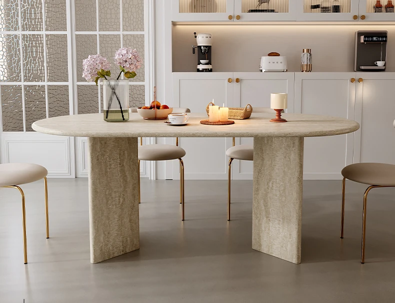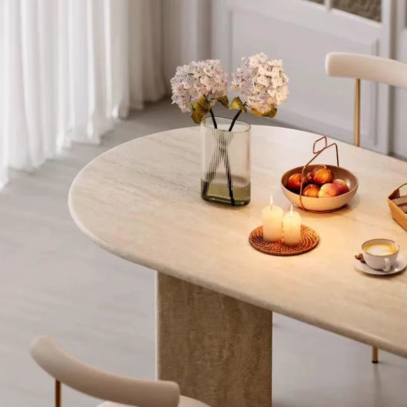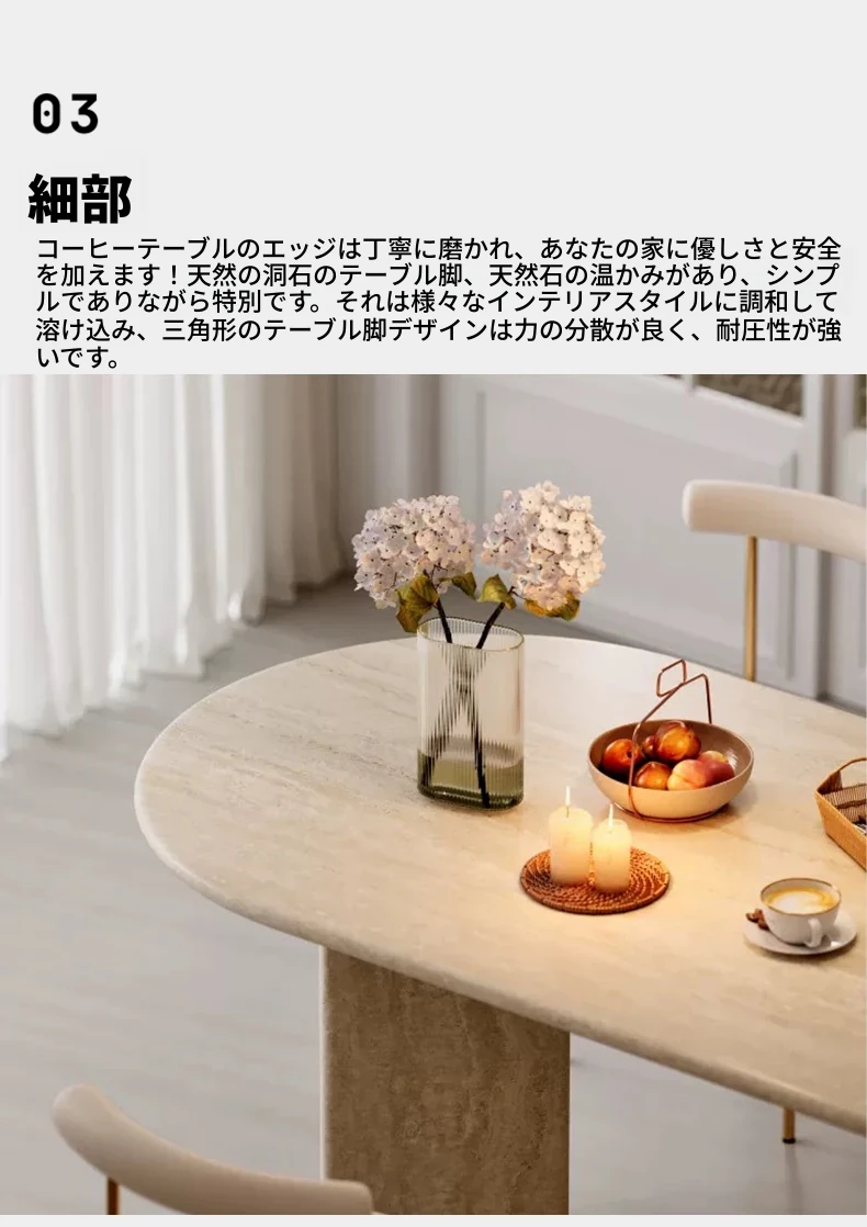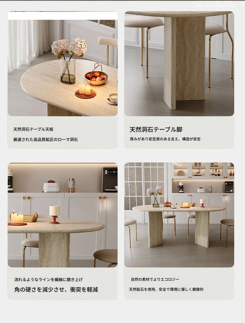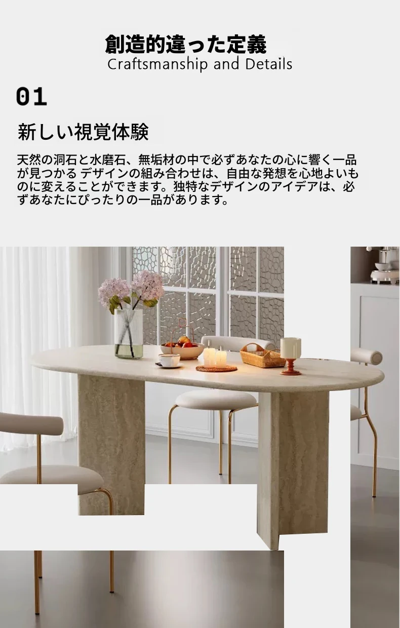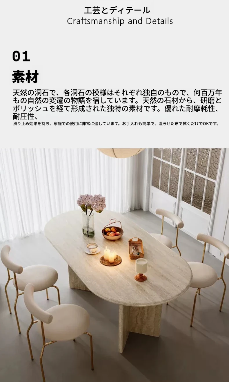 高級感溢れるモダンなシンプルデザインの天然大理石オーバルダイニングテーブル|和の美を感じる侘寂風|家族や友人との特別な時間を演出します。