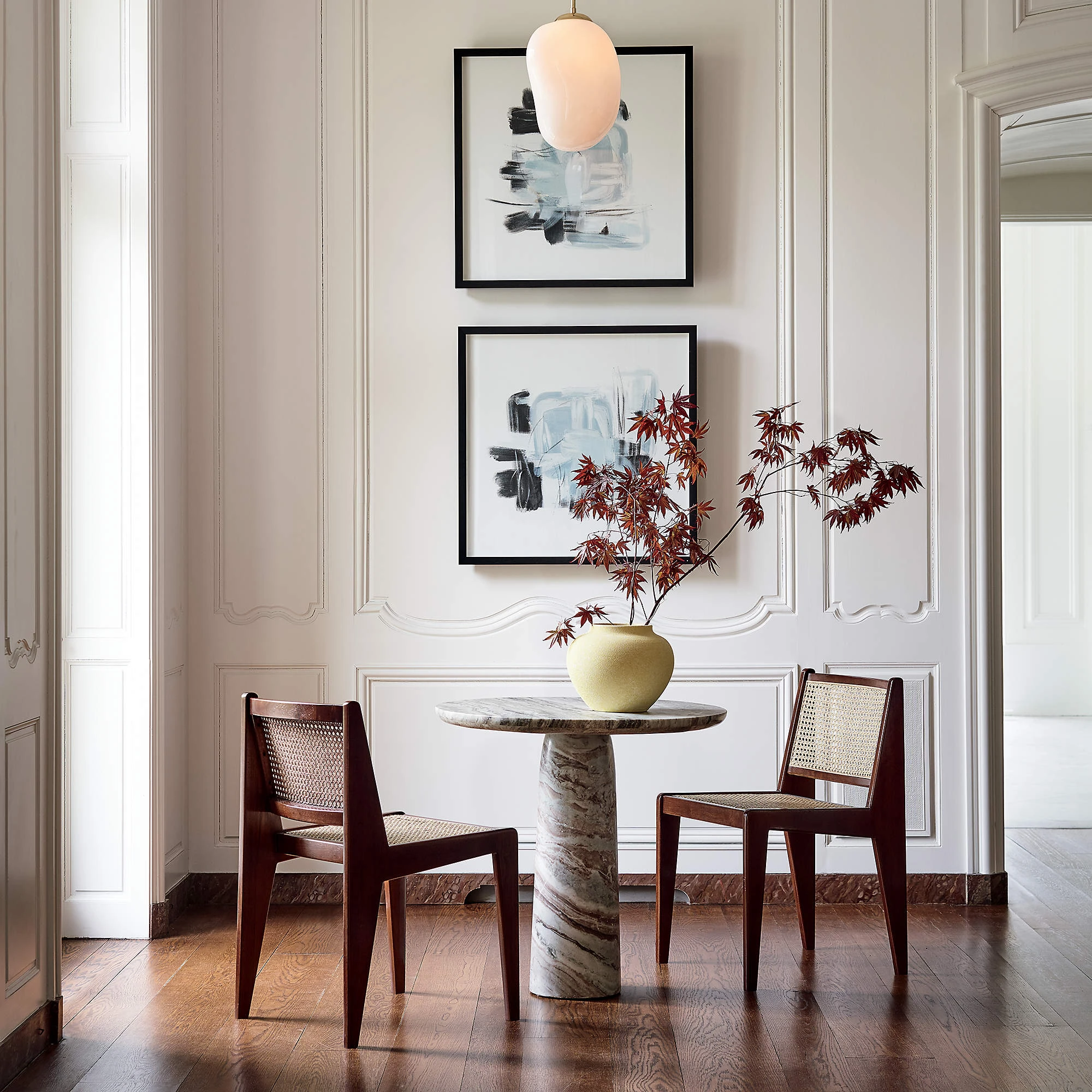 アメリカンラグジュアリー ダイニングテーブルセット|モダンフレンチデザインのシンプルな大理石ラウンドテーブルと6脚の天然木製チェア|洗練された食空間を演出!