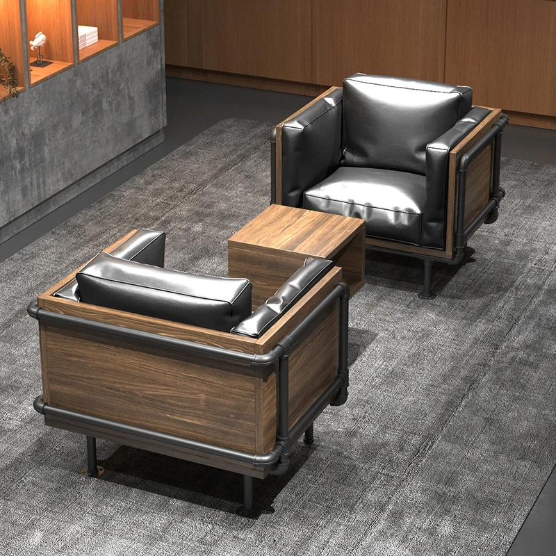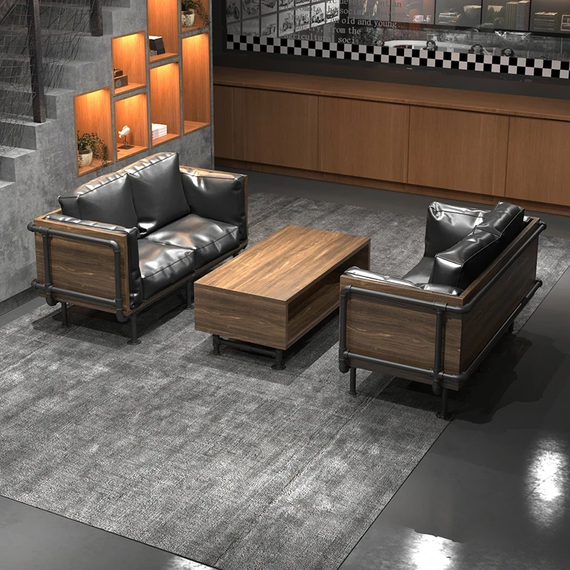 インダストリアルスタイルのオフィスソファ&テーブルセット - 個性的でクリエイティブなデザイン!ビジネスミーティングやおもてなしに最適なリラックススペースを提供します。待機時間も快適に過ごせるおしゃれな家具です。
