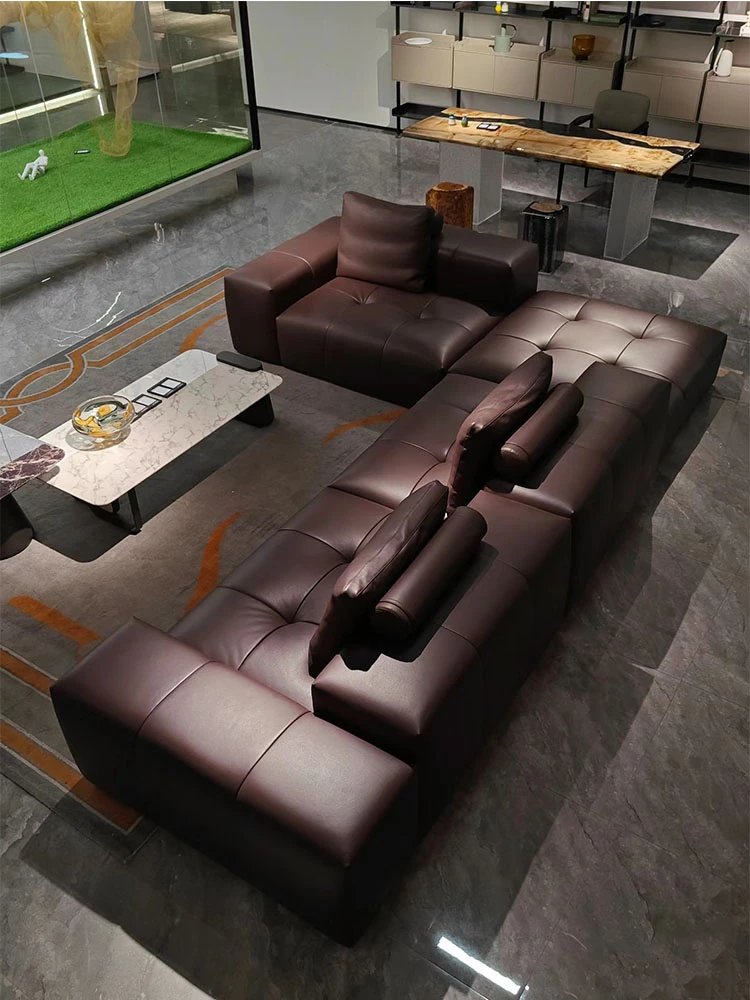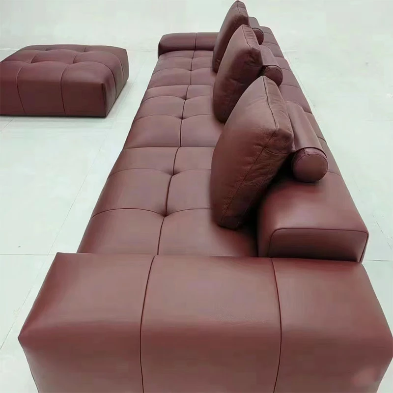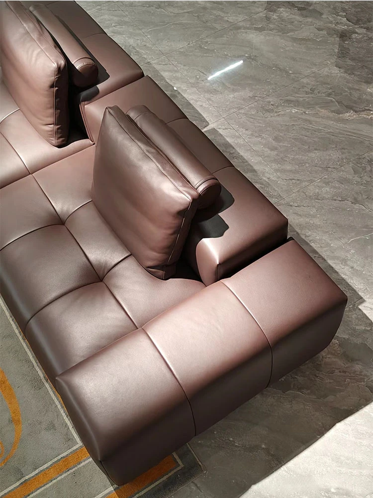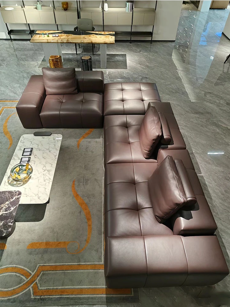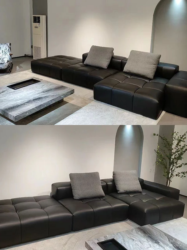 イタリアンミニマルスタイルのサバピクセルモジュラートーフブロック本革ソファ。広々としたリビングにぴったりのヴィラ用フラット階層ソファセット。洗練されたデザインで、快適さとスタイルを両立!