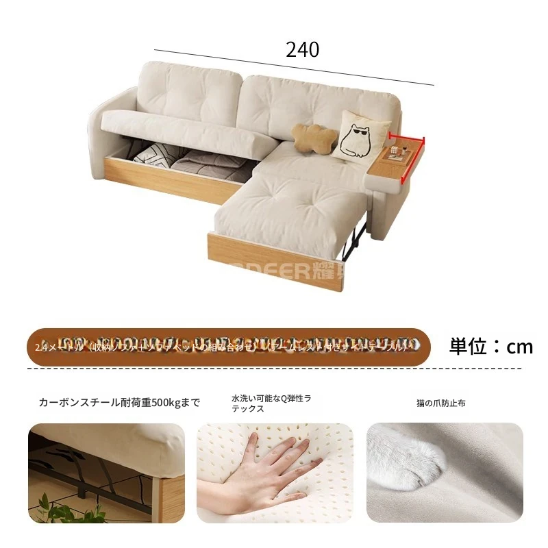 2.4メートル(収納ソファ+ソファベッドセット)(アーム付きテーブル) 猫の爪とぎ布-ラテックスタイプ