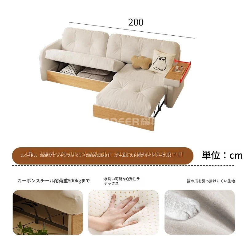2メートル(収納ソファ+ソファベッドセット)(アーム付きテーブル) 猫の爪とぎ布-ラテックスタイプ