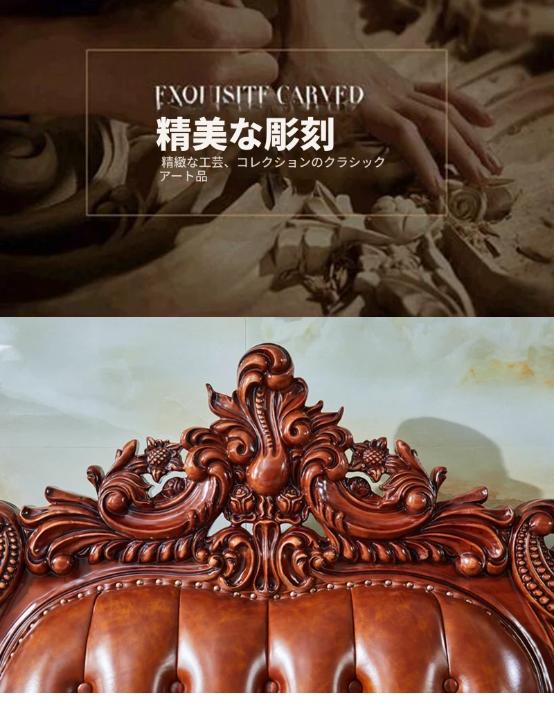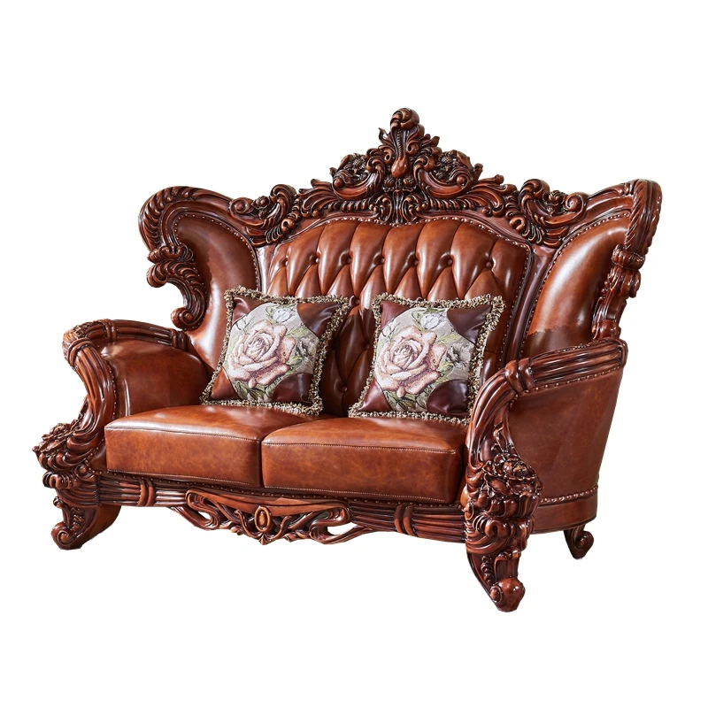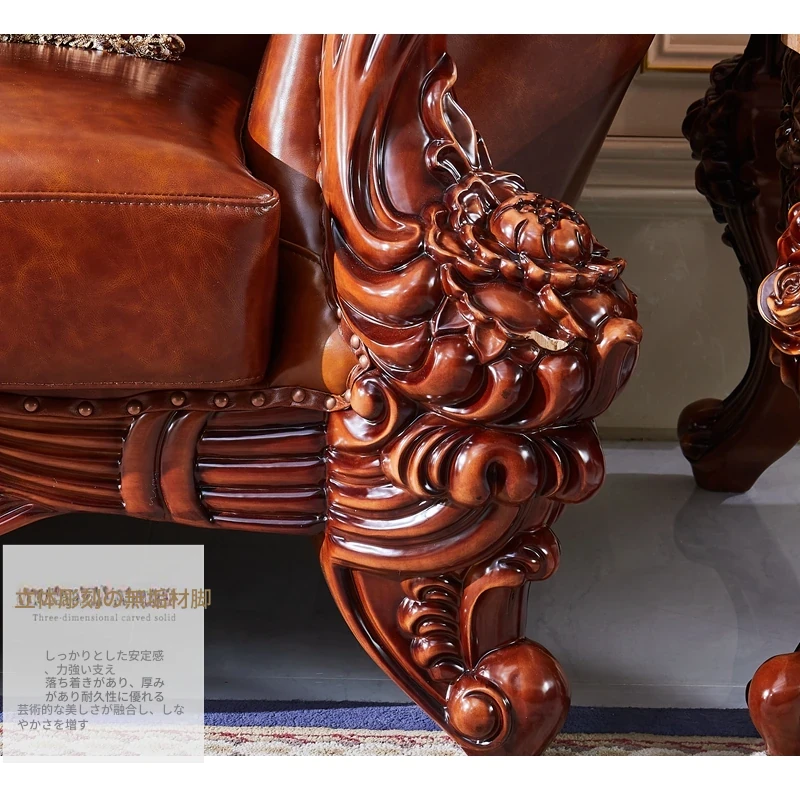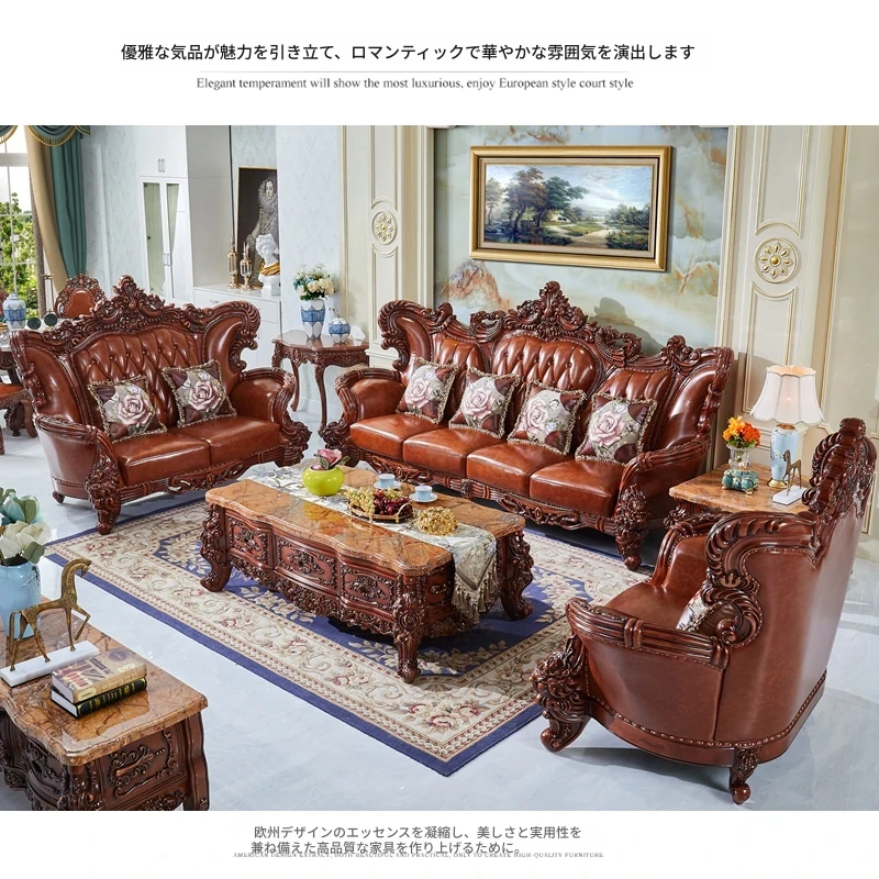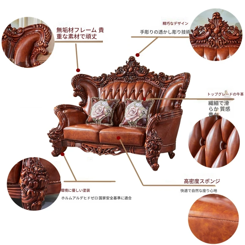 高級欧風本革ソファ|一級皮革&彫刻仕上げの木製フレーム|別荘にぴったりなラグジュアリーなリビングルーム用124cmコンビネーションソファ|広々とした空間を演出します!