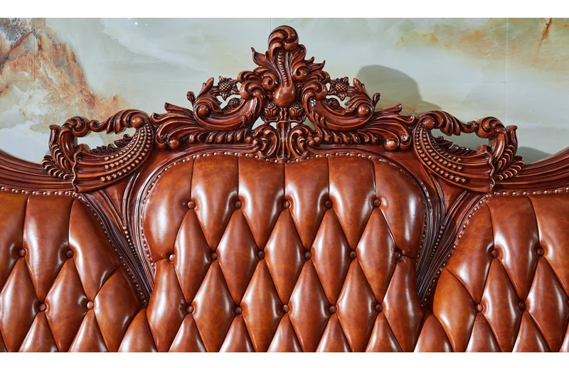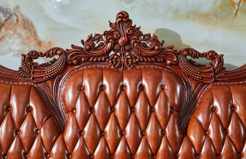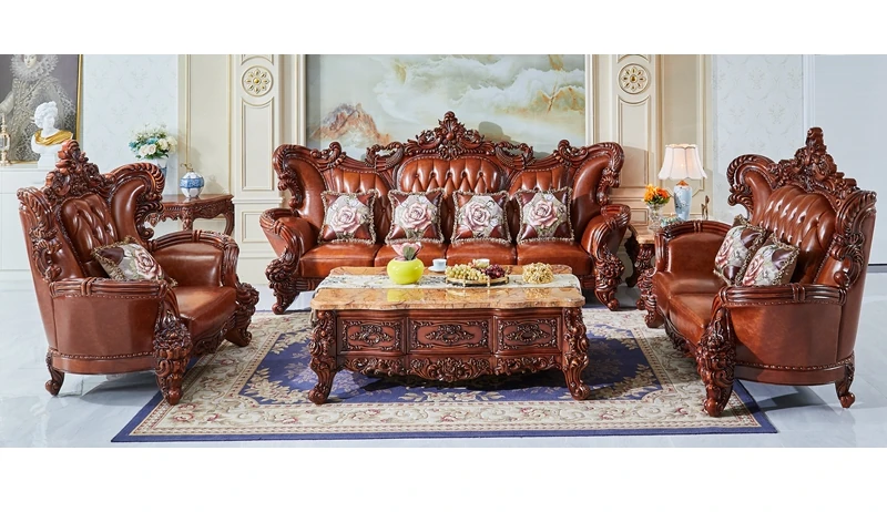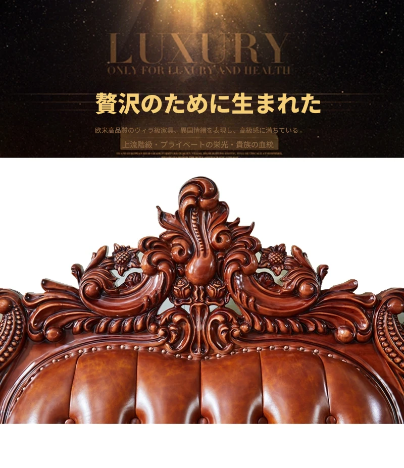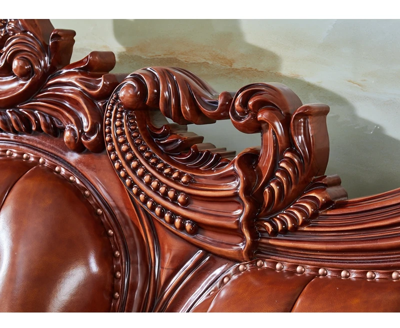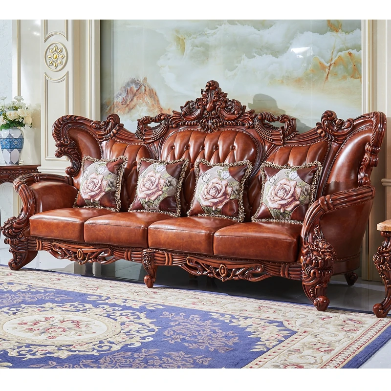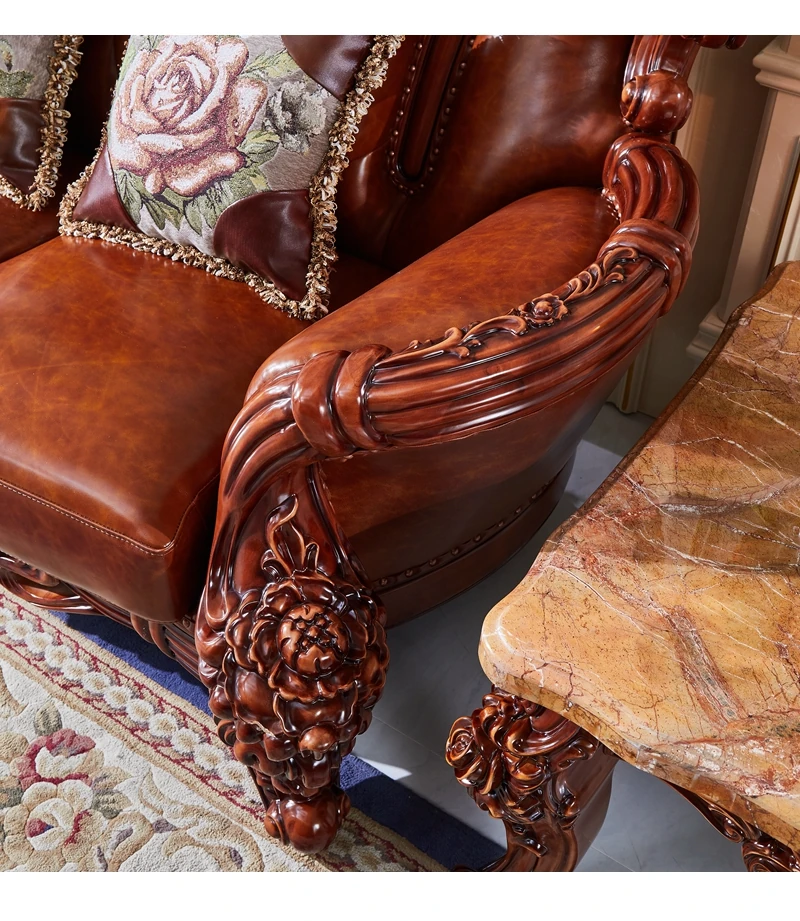 高級欧風本革ソファ|一級皮革&彫刻仕上げの木製フレーム|別荘にぴったりなラグジュアリーなリビングルーム用124cmコンビネーションソファ|広々とした空間を演出します!