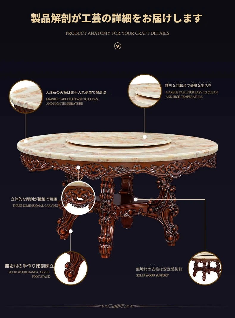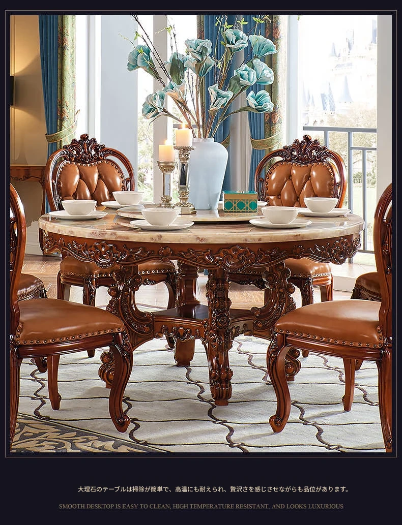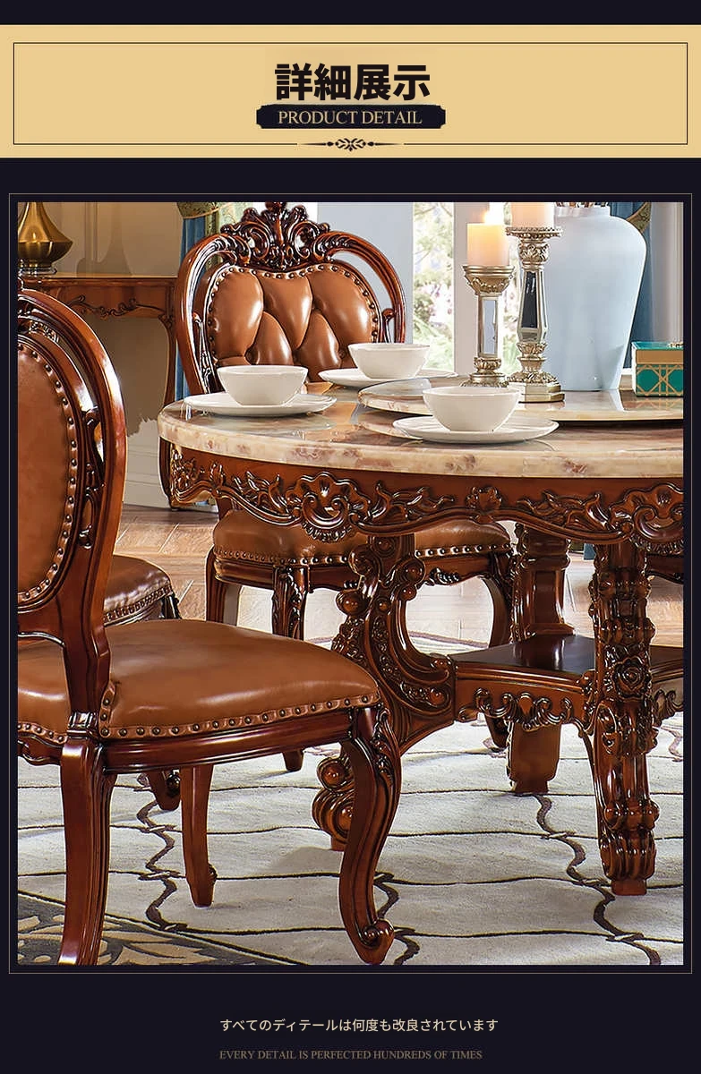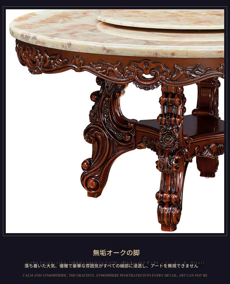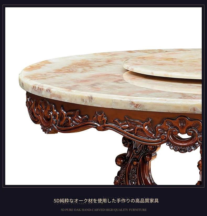 欧風天然大理石ダイニングテーブル|アメリカンスタイルの無垢オーク材使用|新古典的なラグジュアリーラウンドダイニングセット|高級感溢れる空間を演出します!