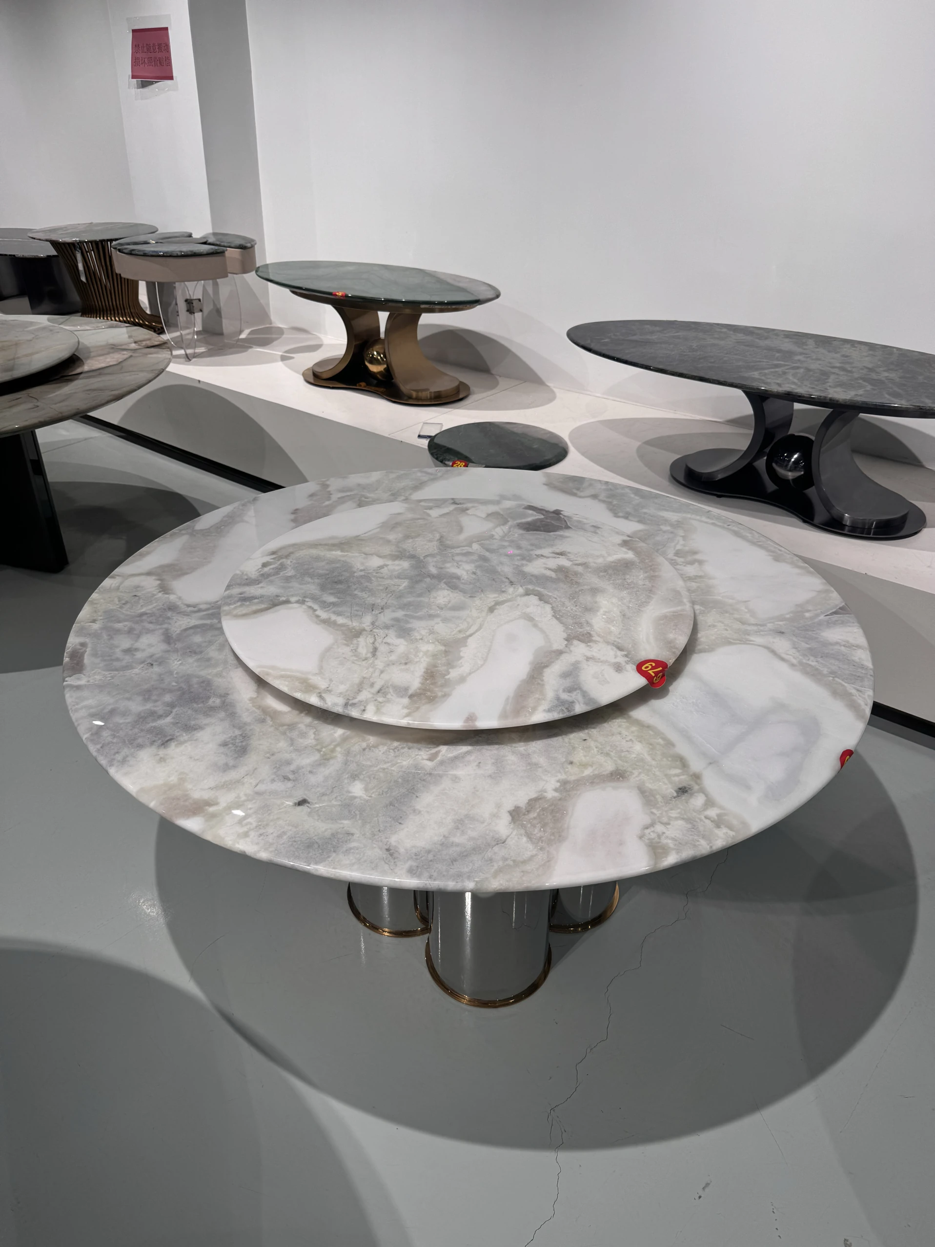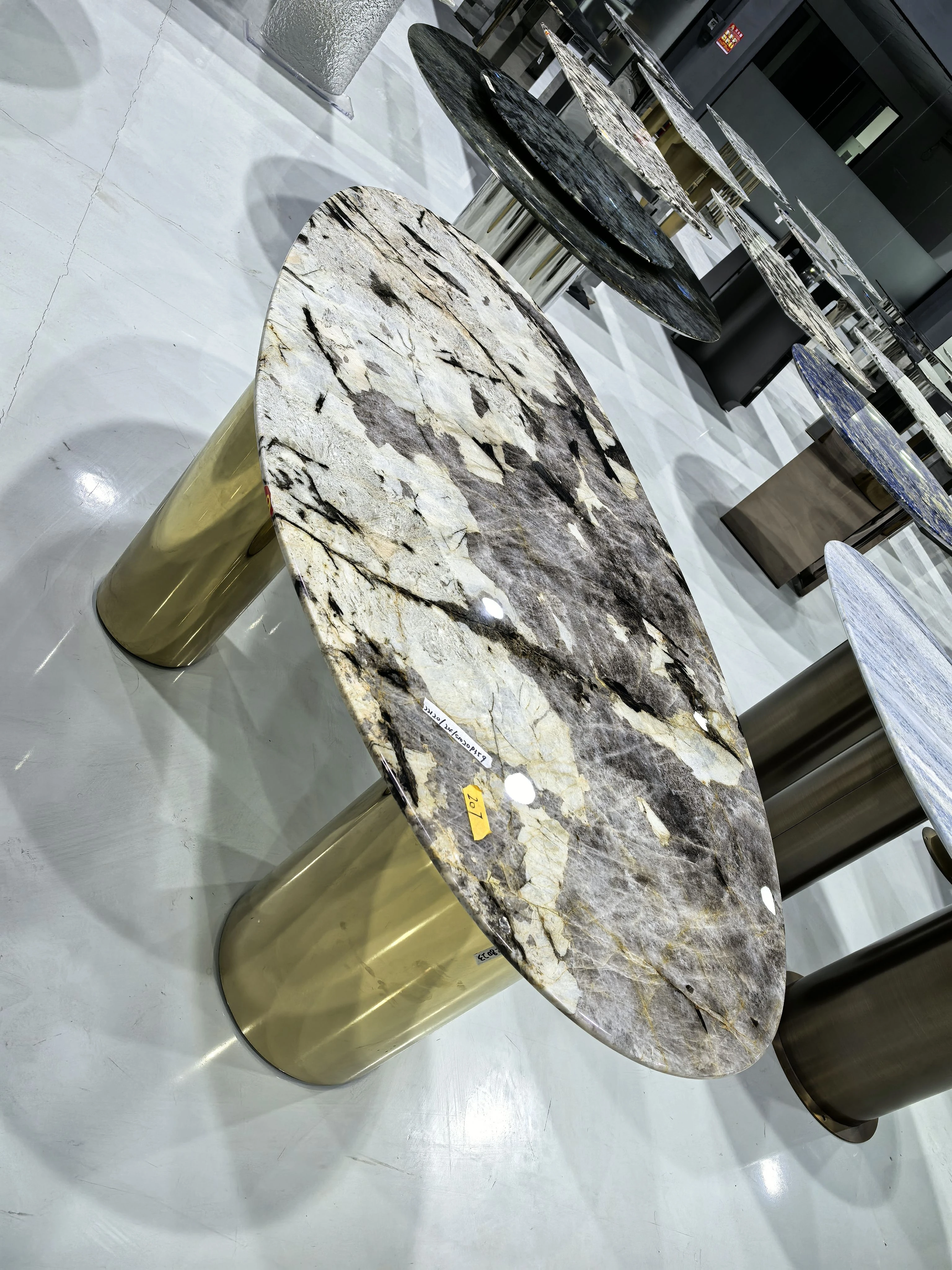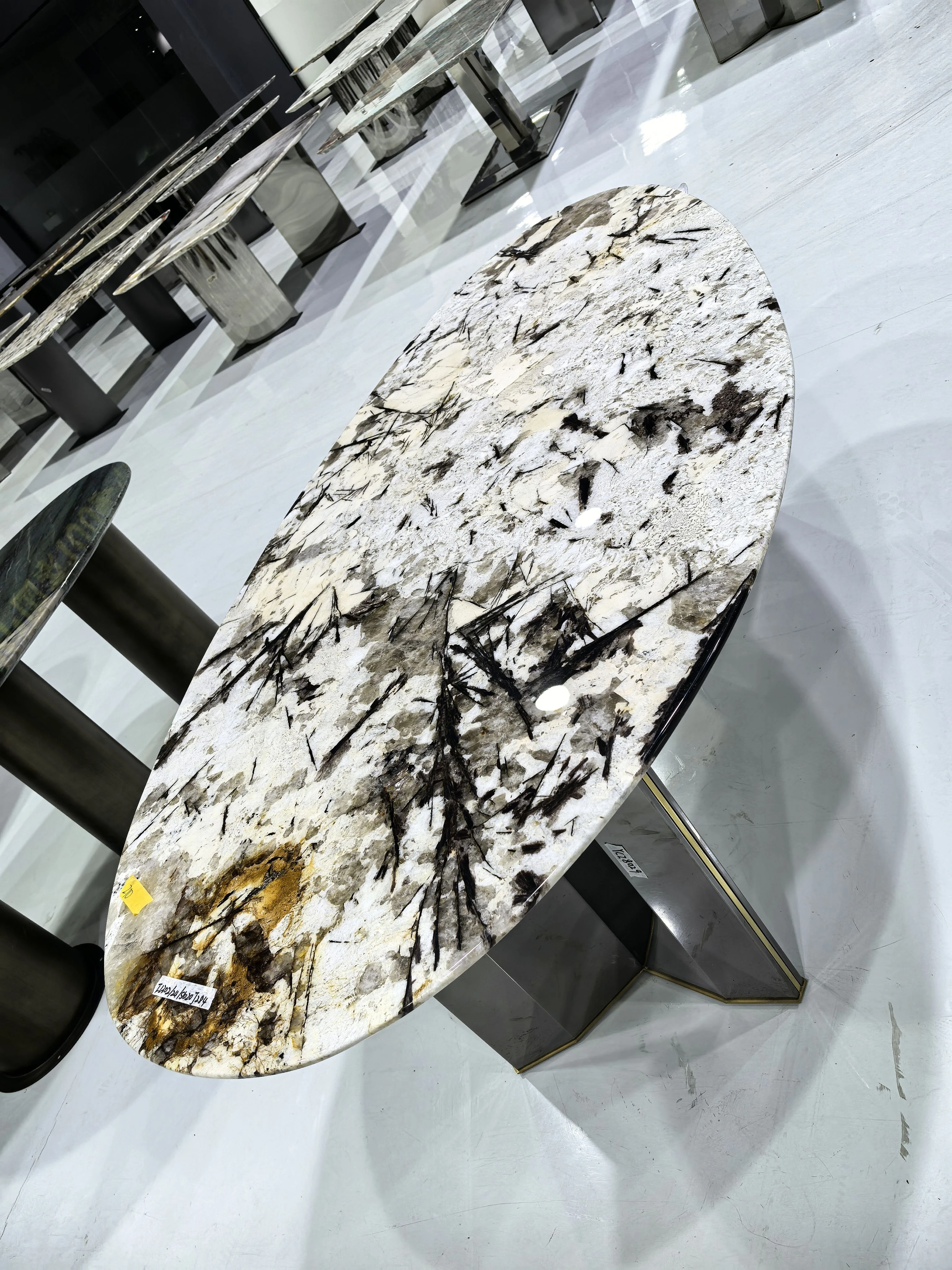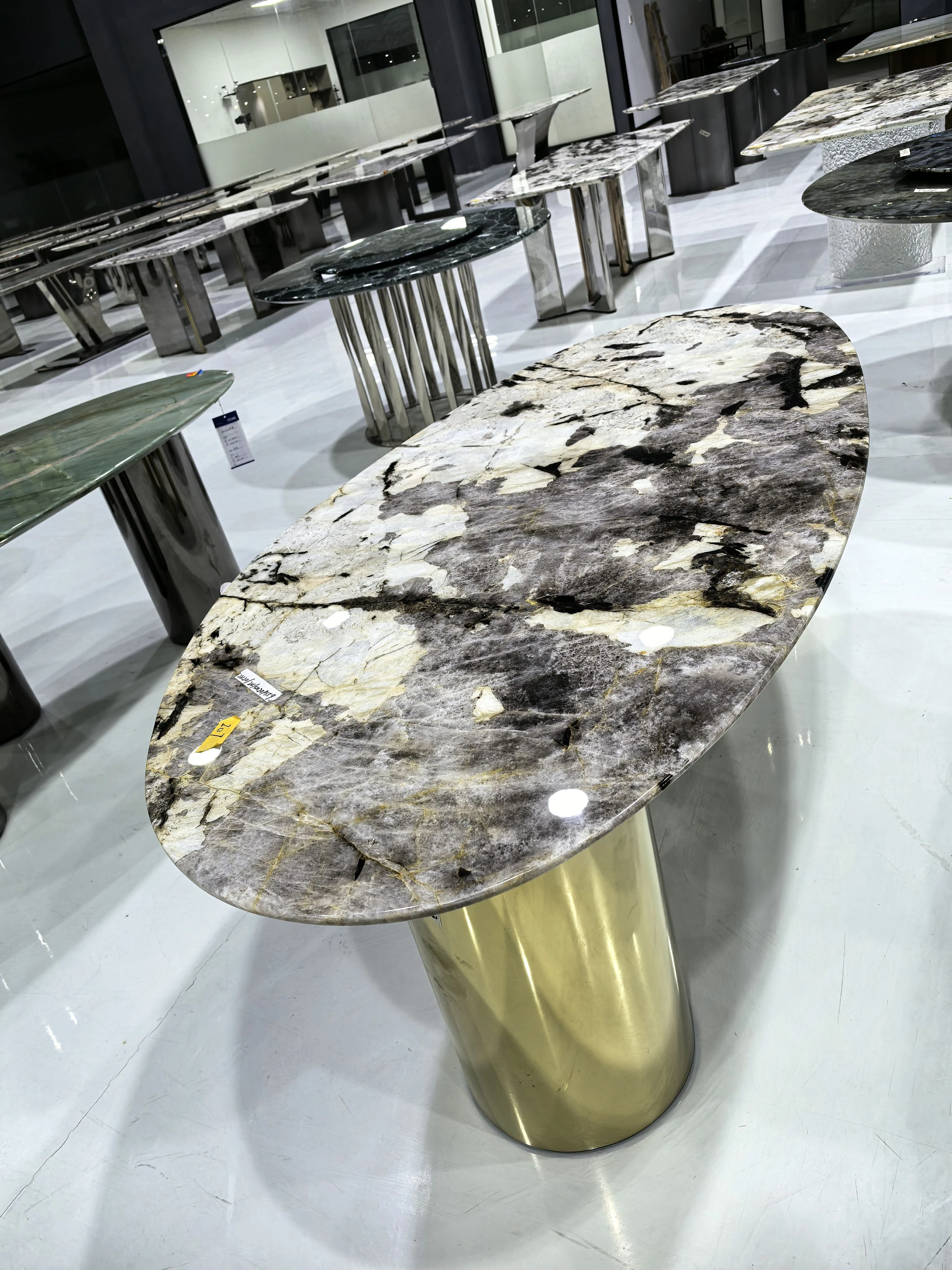 天然輸入老鉱石の贅沢なパンドラダイニングテーブル - イタリアンスタイルの軽やかな高級感!高級別荘にぴったりな楕円形の大理石テーブルで、優雅な食事空間を演出します。