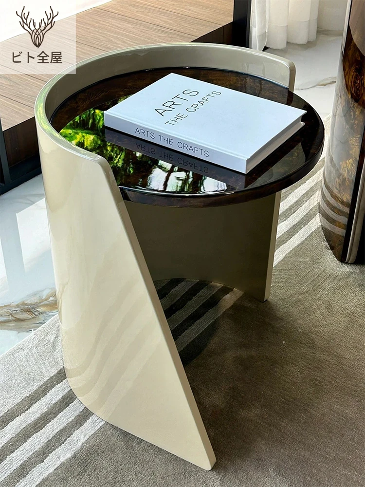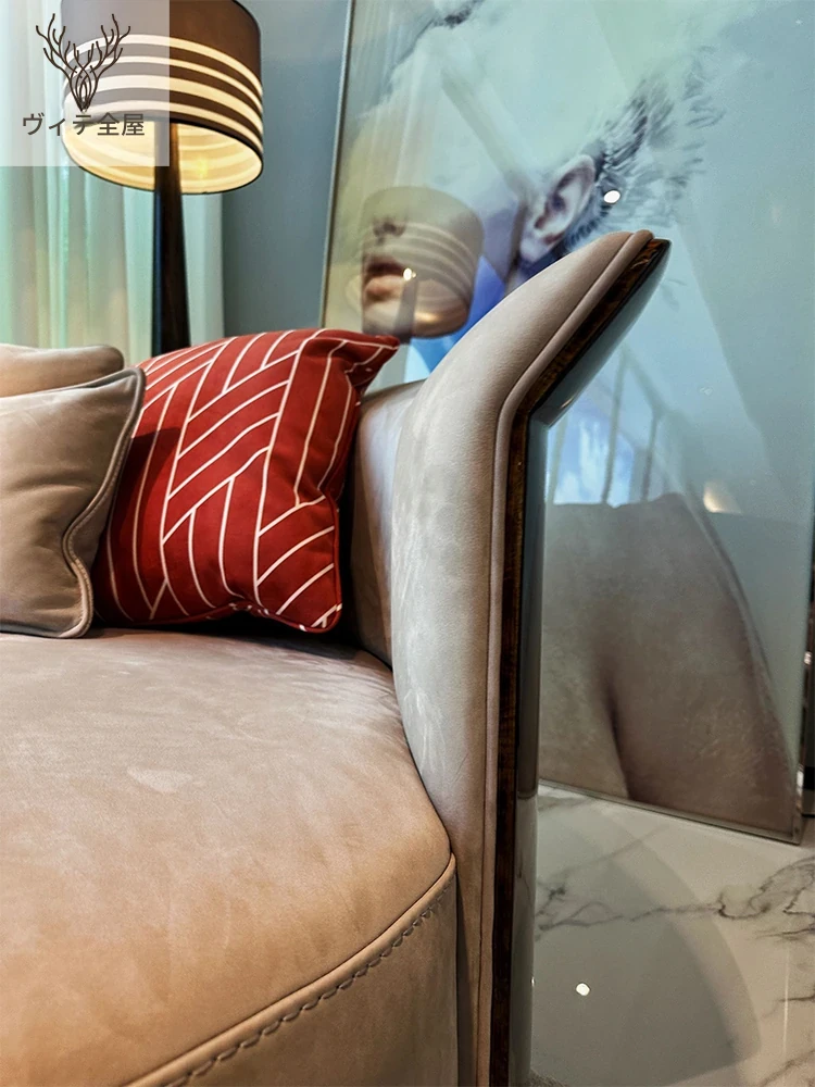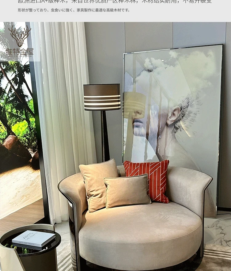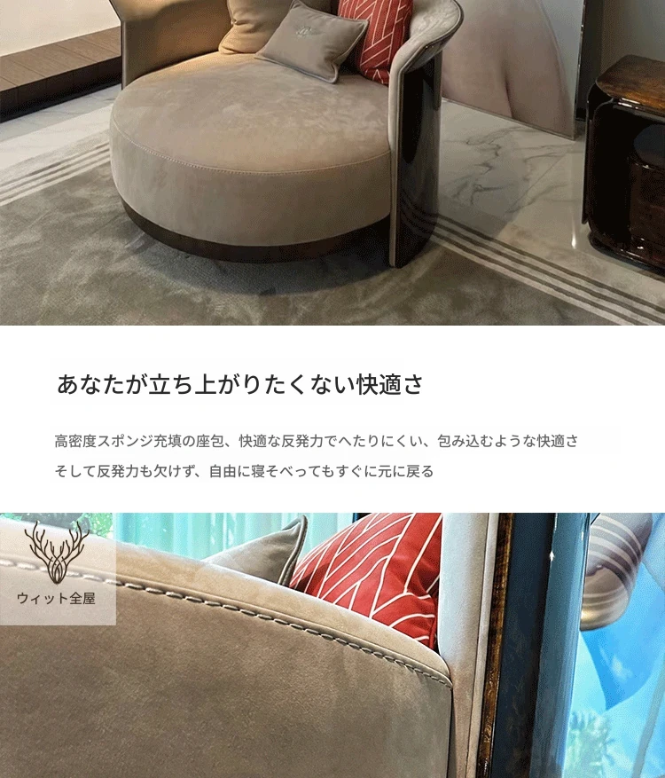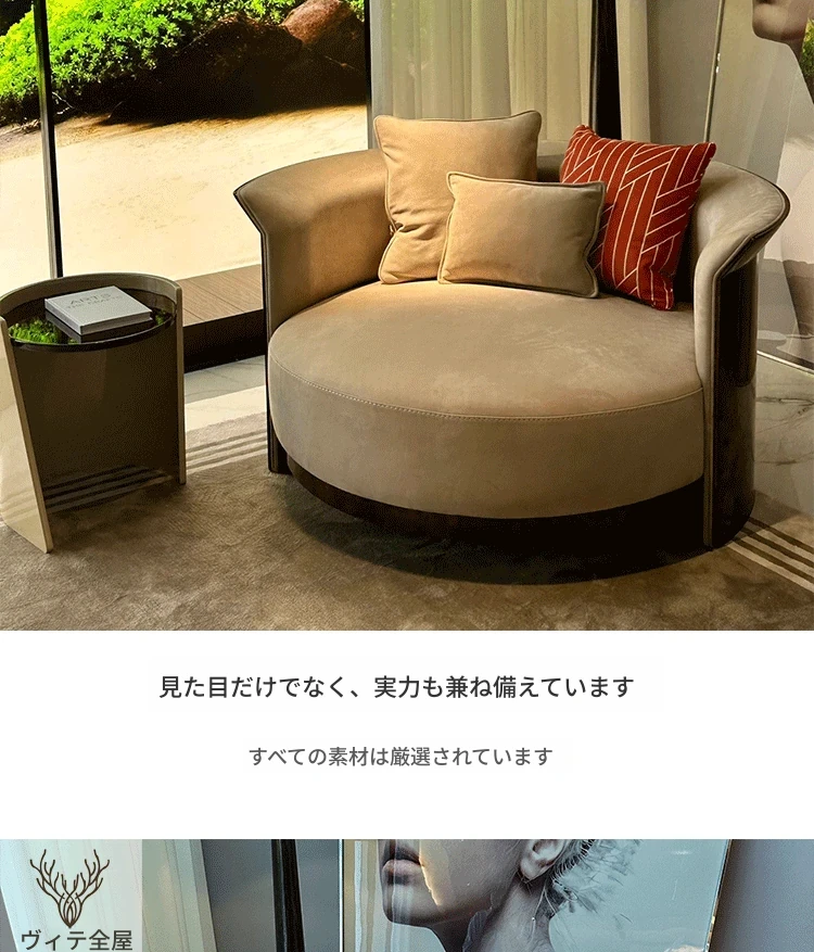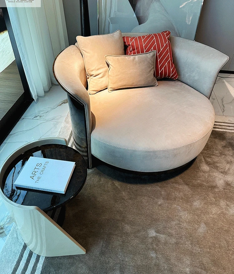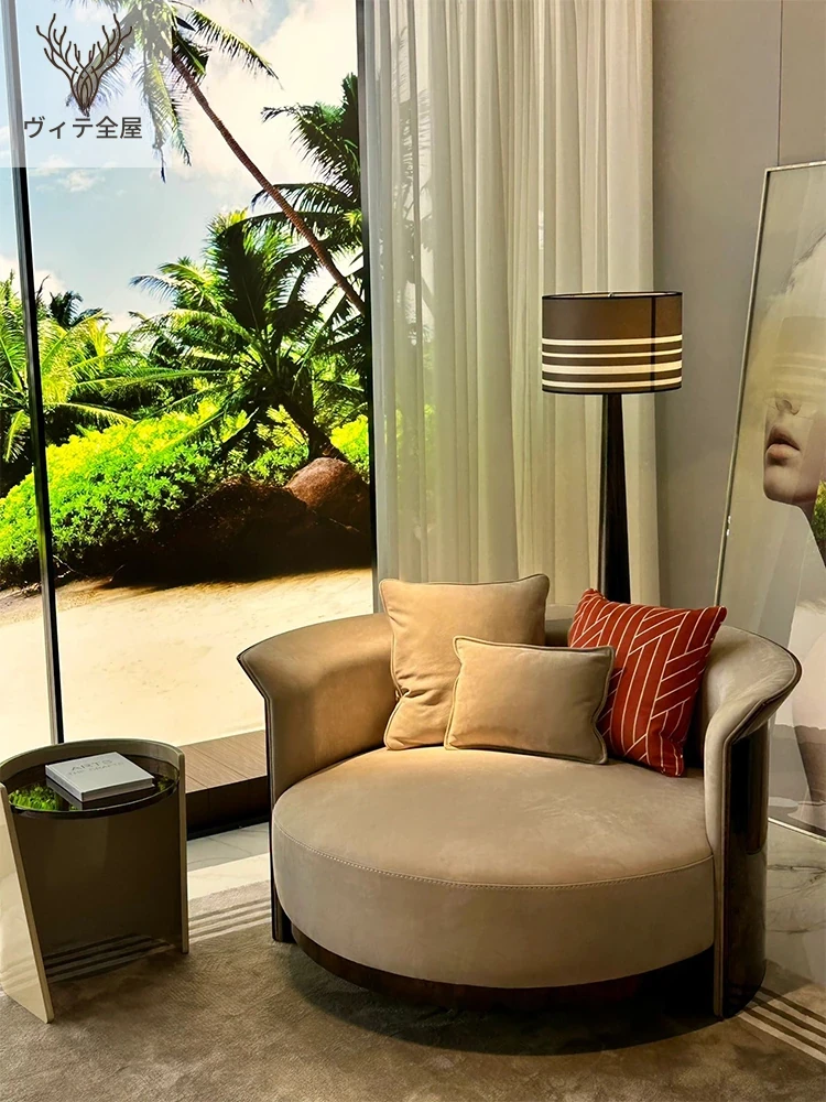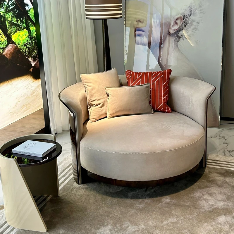 軽奢感溢れるベントレー風ラウンドカップル用リラックスチェア|モダンなイタリアンスタイルの別荘リビング・寝室・バルコニーに最適|高級牛皮と天然木使用で、心地よい座り心地を実現!