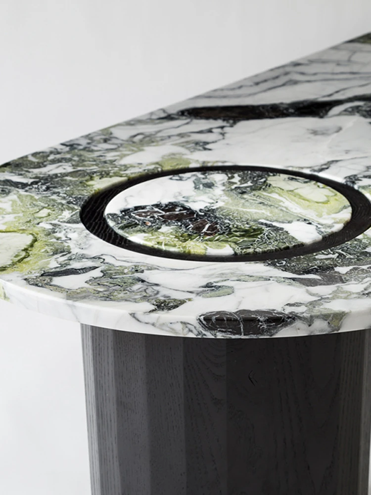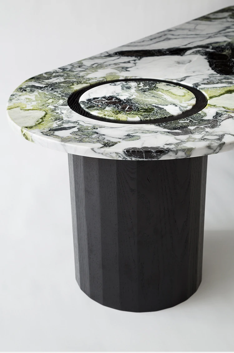 ラグジュアリーなブルークリスタルの天然大理石ダイニングテーブル - モダンでシンプル、回転プレート付きの円形デザイン。高級感溢れるリビング空間を演出し、特別な食事をお楽しみいただけます。