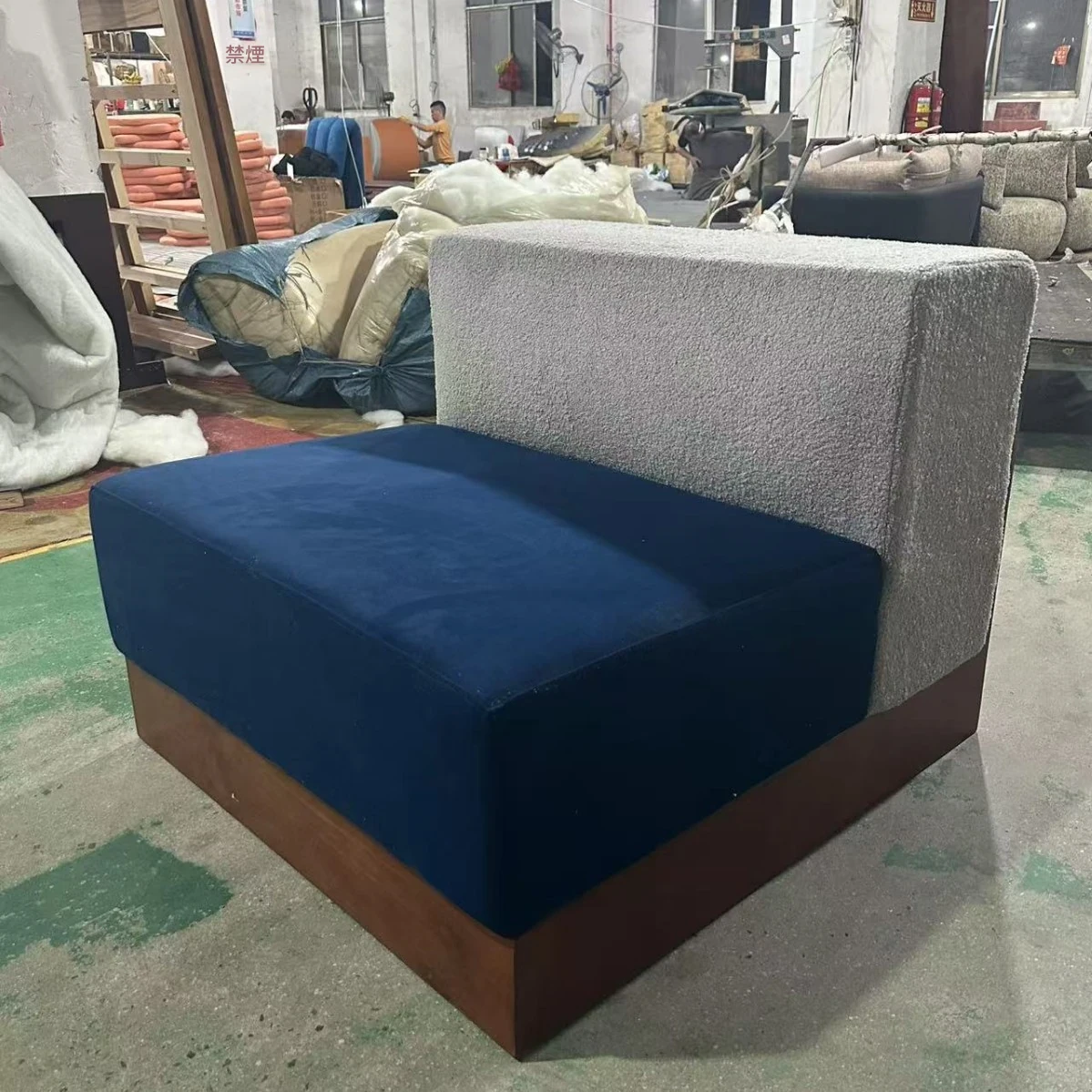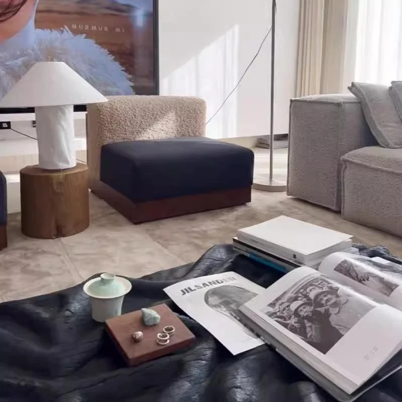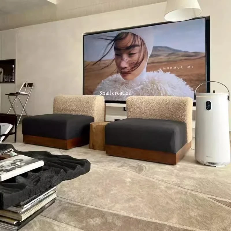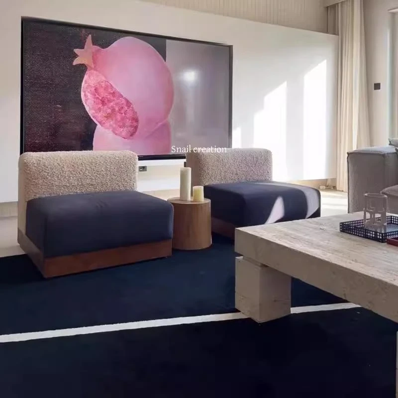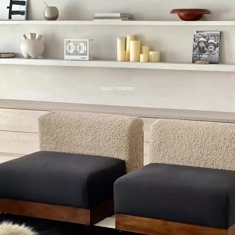 現代的シンプルでラグジュアリーな一人用カラーブロックソファ、ラムスキンと天然木を使用したデザイナーの創造的な一人掛けソファ。あなたのリビングに洗練されたスタイルをプラス!
