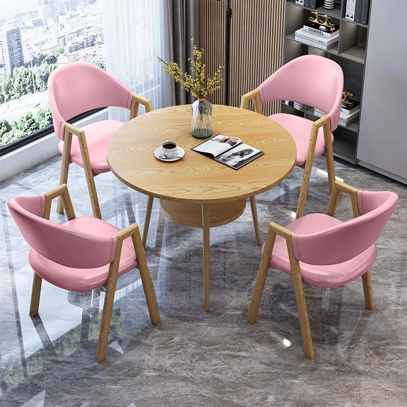 (80ナチュラルウッド色円卓+4レザー椅子)ピンク色